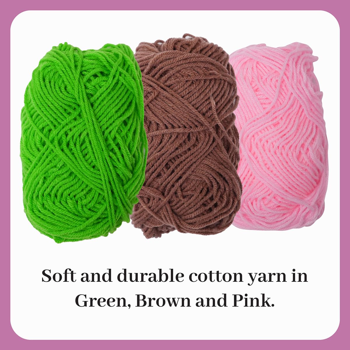 All-in-One Craft Kit: Includes 3 rolls of premium cotton yarn in Pink Green and Brown (1 roll per color) 1 crochet hook 1 cutter and an easy-to-follow instructions paper.