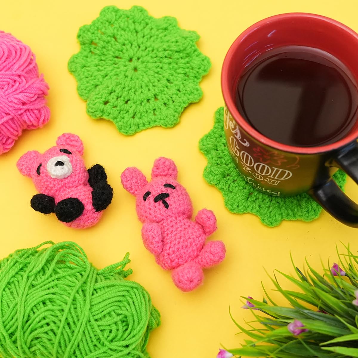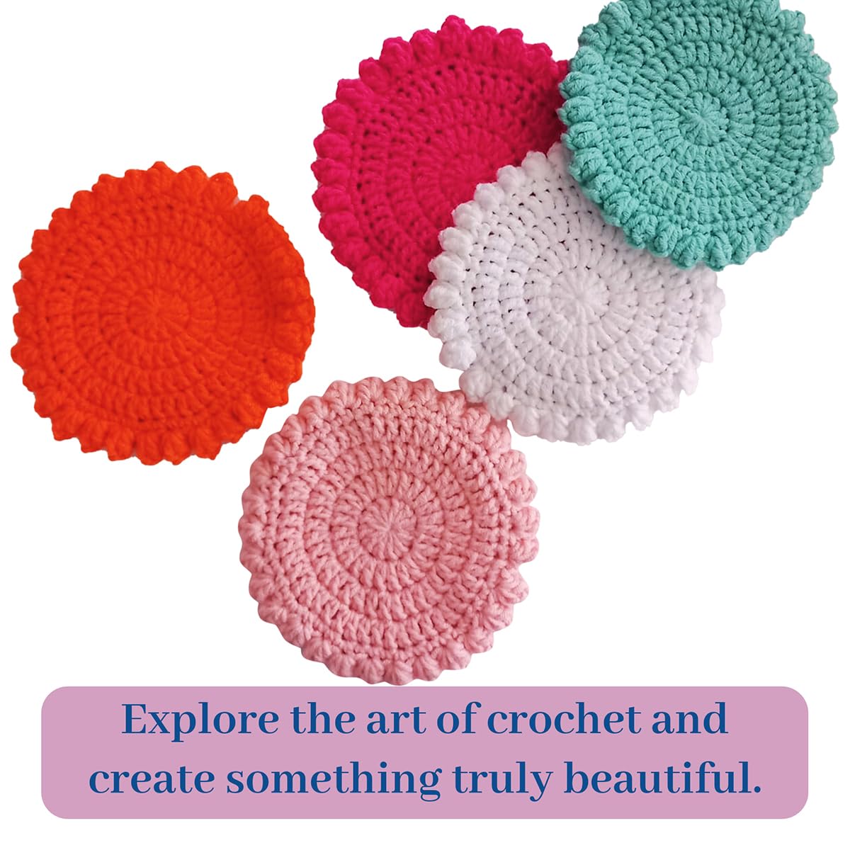 Complete Crochet DIY Kit for Beginners: Create 6 beautiful floral coasters with the pickNMAKE 6 Pcs Blossom Puff Crochet Kit designed for beginners and craft lovers alike.