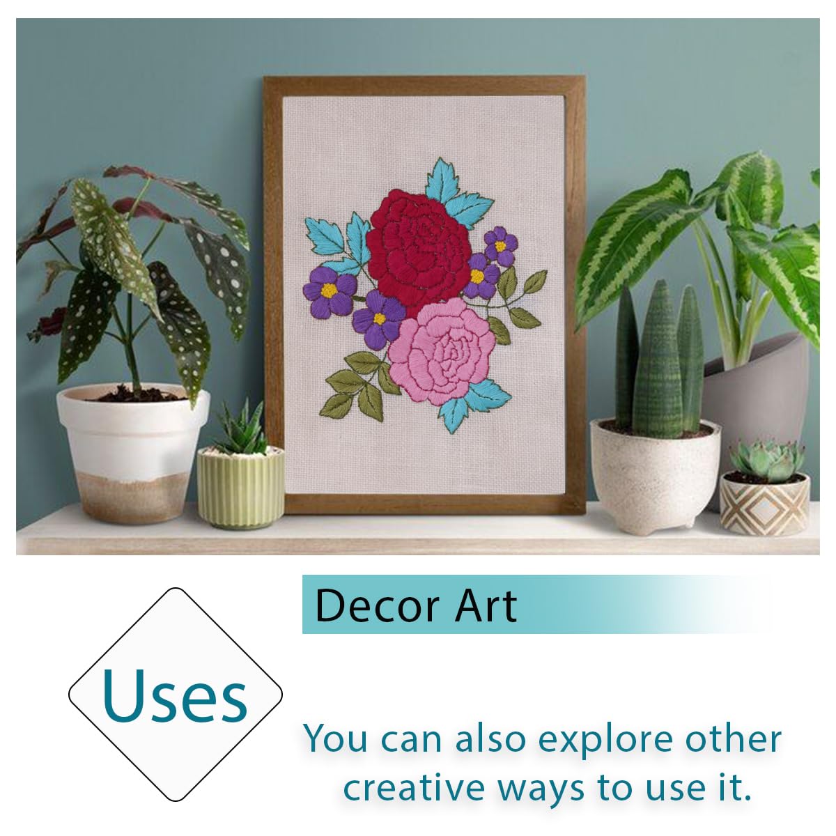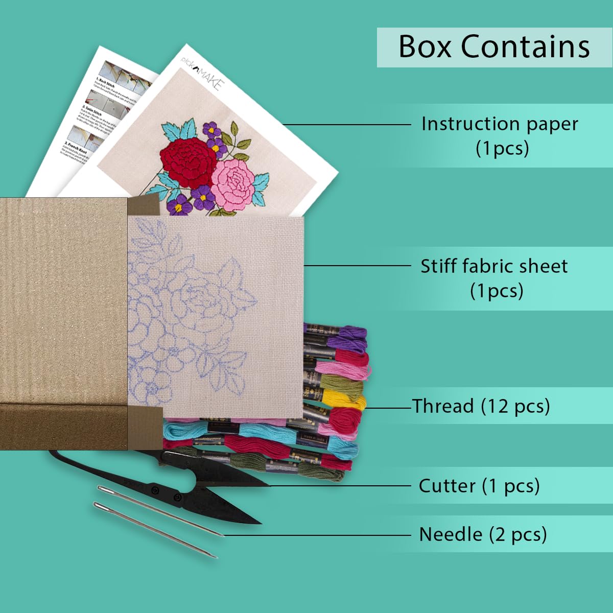 PicknMAKE Hoop-Free Needle Stitch Elegant Blooms DIY Hand Embroidery Kit Set for Beginners Adults Stiff Jute Fabric Art Craft Work Printed Floral Design with Threads Needles Cutter & Instruction