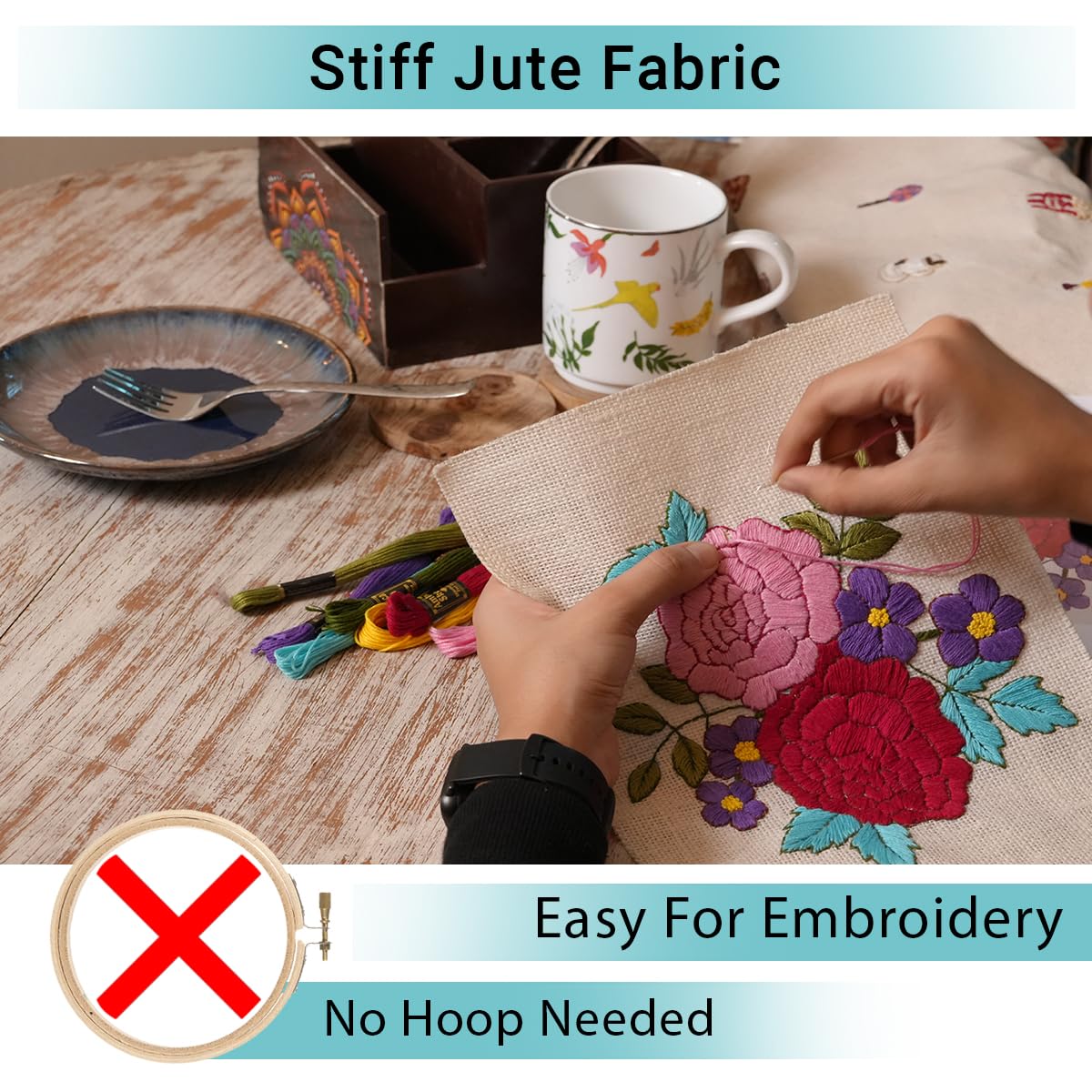 Premium Jute Fabric with Pre-Printed Floral Design Stiff 11"x8" jute sheet allows embroidery without a hoop providing a smooth stable surface for effortless stitching.