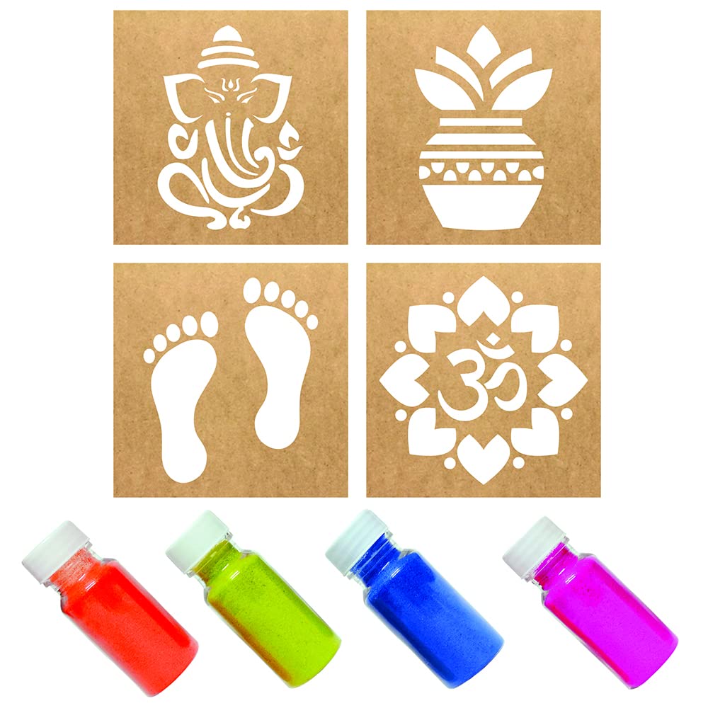 India is a country of festivals and every festival is celebrated with full enthusiasm and excitement by using colors to express your happiness and to welcome Gods Goddess and guests inside your home or office. Decorating Rangoli in or outside house is one of the main and important floor decoration items. To make Rangoli decorations for floor easy way and fun has created some unique Rangoli stencils for floor door entrance rangoli making tools kit with attractive and unique designs that will enhance the decor of your house. It comes with 4 vibrant rangoli colours which are highly quality free flowing colors. Rangoli Stencils are used with different names in the country like Kolam stencils Kolam Achu Designs. You can create big rangoli using combination of stencils by buying more than 1 combo of various designs. Different design rangoli stencils available in various combinations Om Swastik Diya Laxmi Charan Kalash Lotus Ganesha various flower patterns.