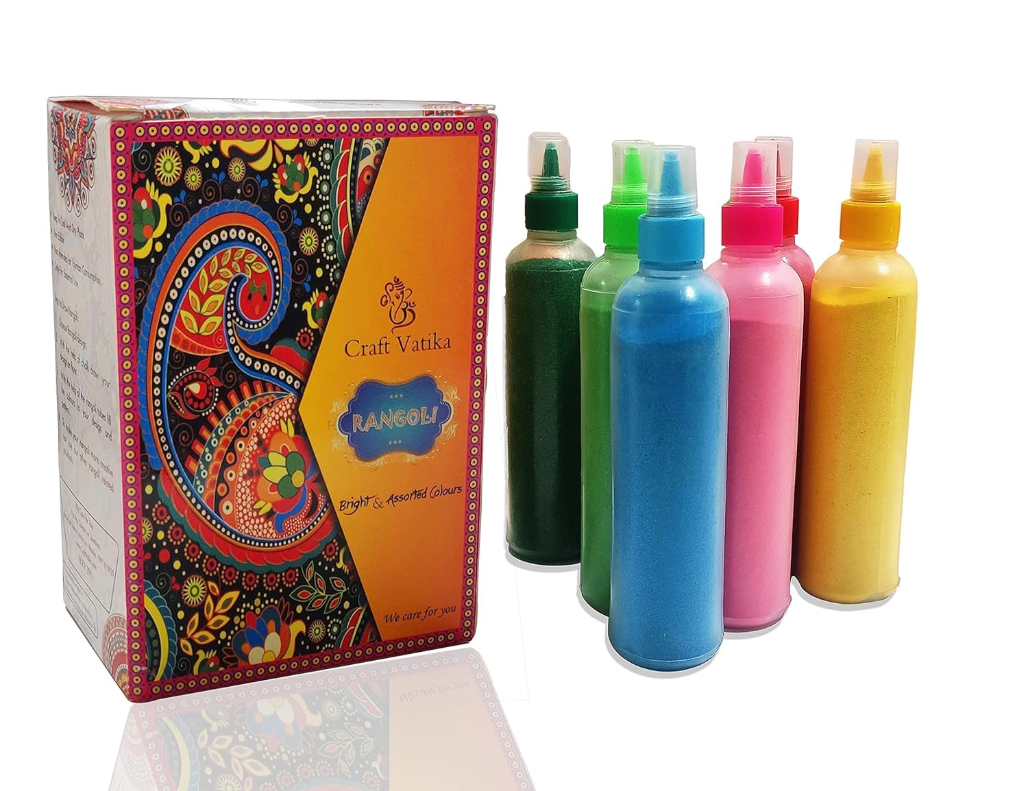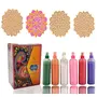 Rangaoli Package Contain: Set of 6 Multicolour Rangoli color bottles and Set of 6 Multicolour and reusable 4 rangoli stencils template.