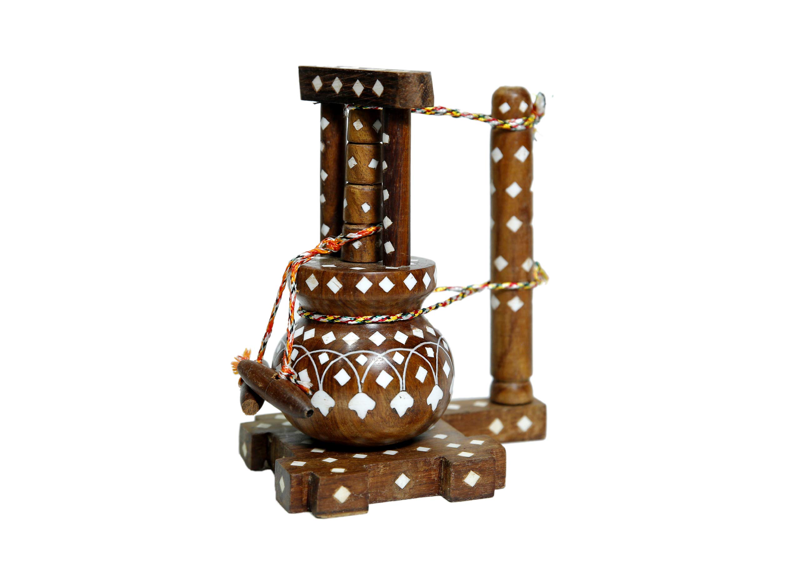 HANDMADE SHEESHAM WOOD ACRYLIC INLAID CHARKHA MADHANICHAKKI AND PIDDHI SET. CHARKHA WHEEL SIZE 3 INCH CHATTI SIZE- 3 INCH MATKA SIZECHAKKI SIZE- 5 INCH AND PIDDHI SIZE - 5 INCH
