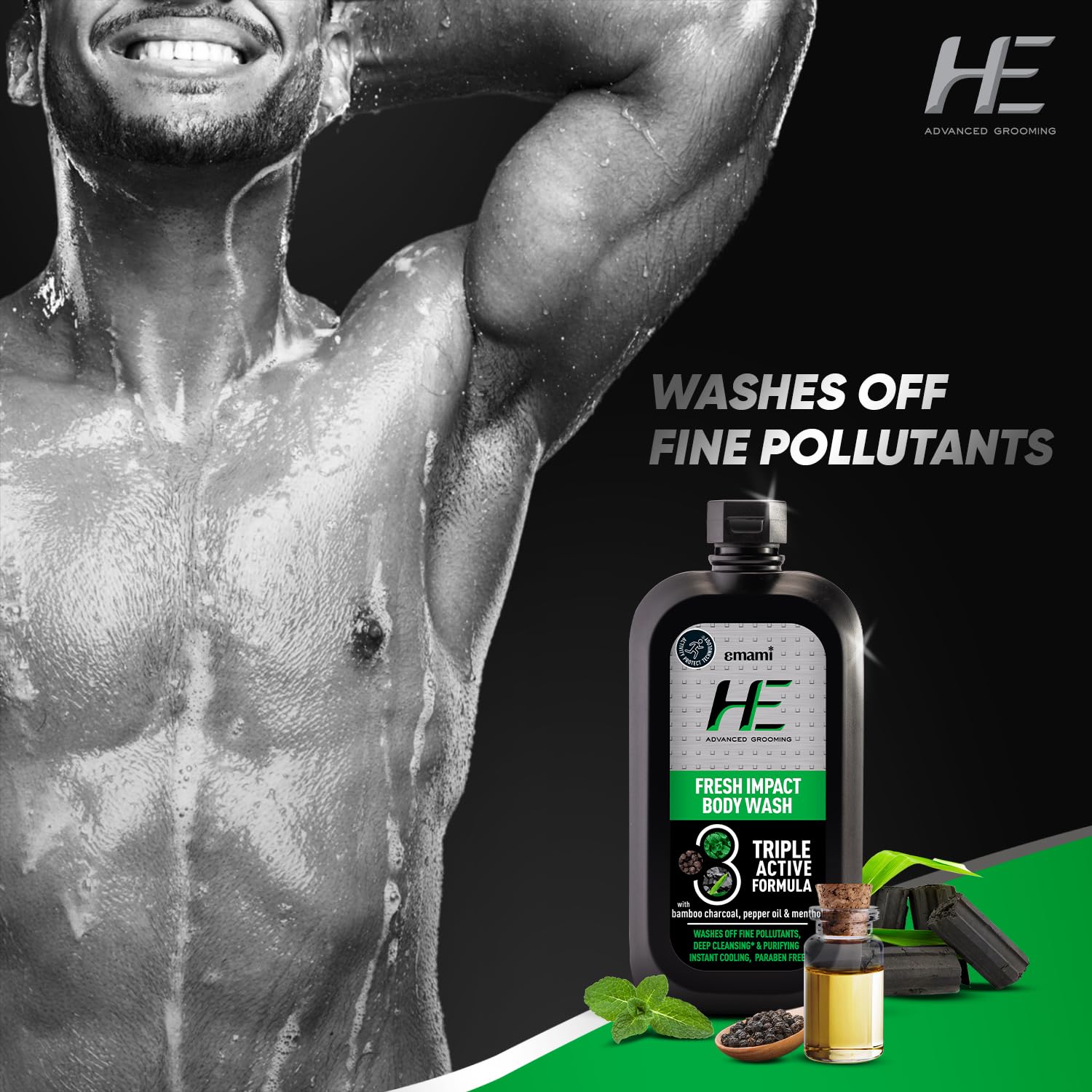 Introducing HE Body Wash specially crafted for men seeking more from their grooming routine. Formulated with an innovative Triple Active fomula that blends the detoxifying power of charcoal with the aromatic experience of pepper oil & refreshing coolness of menthol this Body Wash offers a long lasting manly fragrance and a rejuvenating sensation.