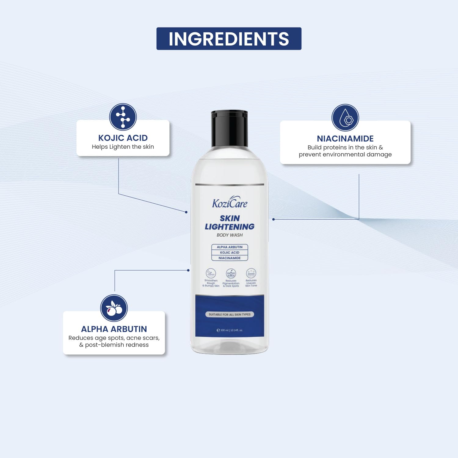 Introducing the Kozicare Soap Skin Lightening Body Wash Gel perfect for your daily cleansing routine. This body wash gel is enriched with Kojic Acid and Alpha Arbutin making it a skin brightening solution that effectively reduces pigmentation and dark spots revealing a brighter complexion. Enjoy gentle cleansing that removes impurities and excess oil without stripping the skin of its natural moisture. Infused with hydrating ingredients this body wash gel keeps the skin moisturized and supple preventing dryness and discomfort. Incorporating this body wash gel into your daily skincare routine revitalizes and refreshes the skin providing a healthier and more youthful appearance. Suitable for both women and men this gel is a must-have for those looking for a product that combines affordability with positive feedback and brand trustworthiness. The Fresh scent adds a pleasant aroma to your shower experience. With a 300 ml size this body wash gel is perfect for use in the bathroom ensuring a moisturizing effect while cleansing the skin well. Upgrade your shower routine with Kozicare Soap Skin Lightening Body Wash Gel for brighter and revitalized skin.