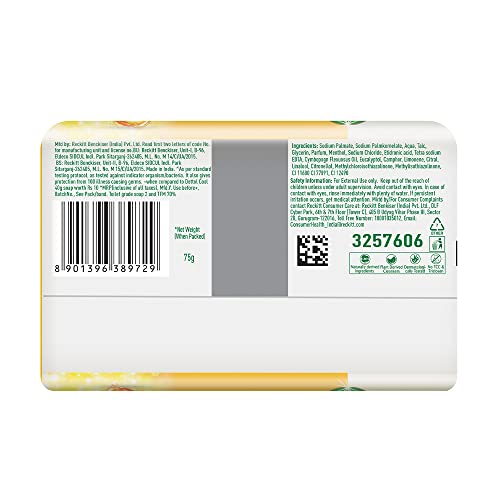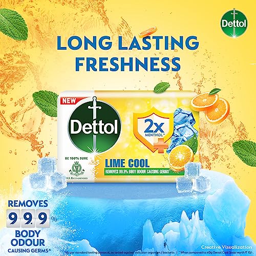 Be 100% sure to protect your skin from 100 illness-causing germs and bacteria with the Dettol Lime Cool Bathing Soap bar. It contains Lime and 2x menthol which gives long lasting freshness and energized feeling. It also removes 99.9% body odour causing germs. The trusted germ-protection formula of Dettol soap acts like a barrier between your skin and a wide range of unseen germs. Safety Information: Keep out of reach of children unless under adult supervision. Avoid direct contact with eyes. In case of contact with eyes rinse immediately with plenty of water. If persistent irritation occurs get medical attention.