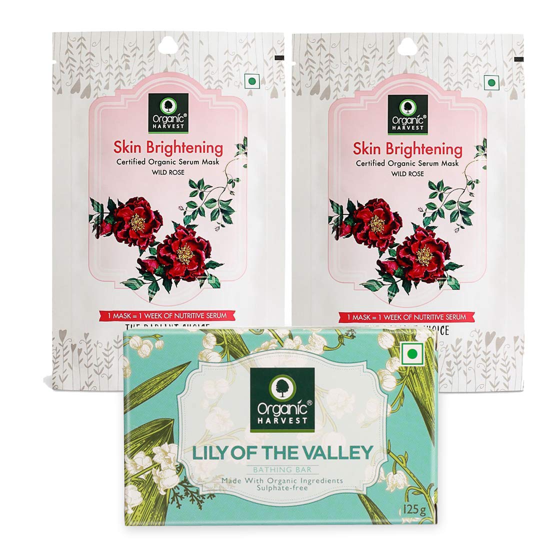Organic Harvest Lily Bathing Bar can be used as a gentle cleanser on a daily basis. It effectively cleanses the skin while locking in the moisture to the skin. It is made of organic and sulphate free ingredients and provides necessary nourishment and moisturisation to the skin. Organic Skin Brightening Sheet Mask is a organic product made with plant-derived ingredients. It keeps the skin radiant and glowing by improving skin tone and texture improving skin elasticity and reducing pigmentation. One sheet mask provides a weekâs worth of nutritive serum which is light textured and is easily absorbed into the skin which helps in adequate nourishment and hydration to the skin.