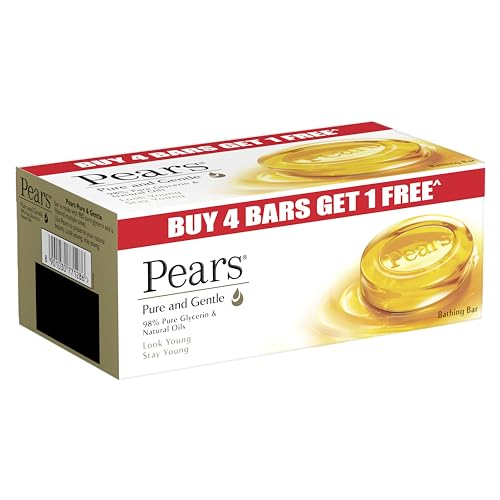 Pears Pure & Gentle Soap Bar (Buy 4 get 1 free) - With Glycerin for Soft, Glowing Skin & Body, Paraben-Free Body Soaps For Bath