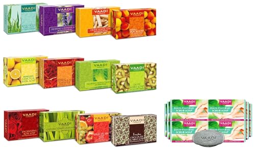 VAADI HERBALS Assorted Luxurious Handmade Herbal Soaps, 75g (Pack of 12) & Elbow-Foot-Knee Scrub Soap with Almond and Walnut, 75g (Pack of 12)