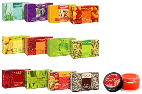 VAADI HERBALS Lip Balm, Strawberry and Honey, 10g & Assorted Luxurious Handmade Herbal Soaps, 75g (Pack of 12)