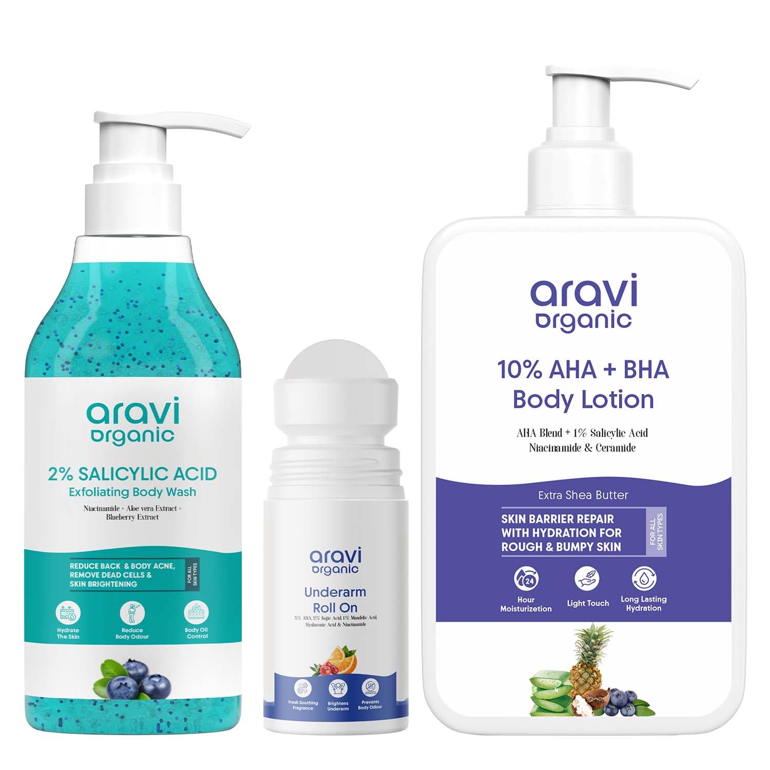 Aravi Organic Body Wash & Under Arm Roll On & AHA BHA Body Lotion Complete Skincare Set for Smooth Bright and Fresh Skin