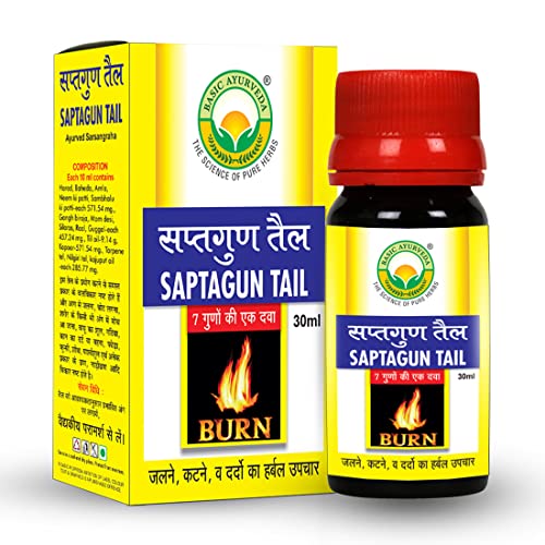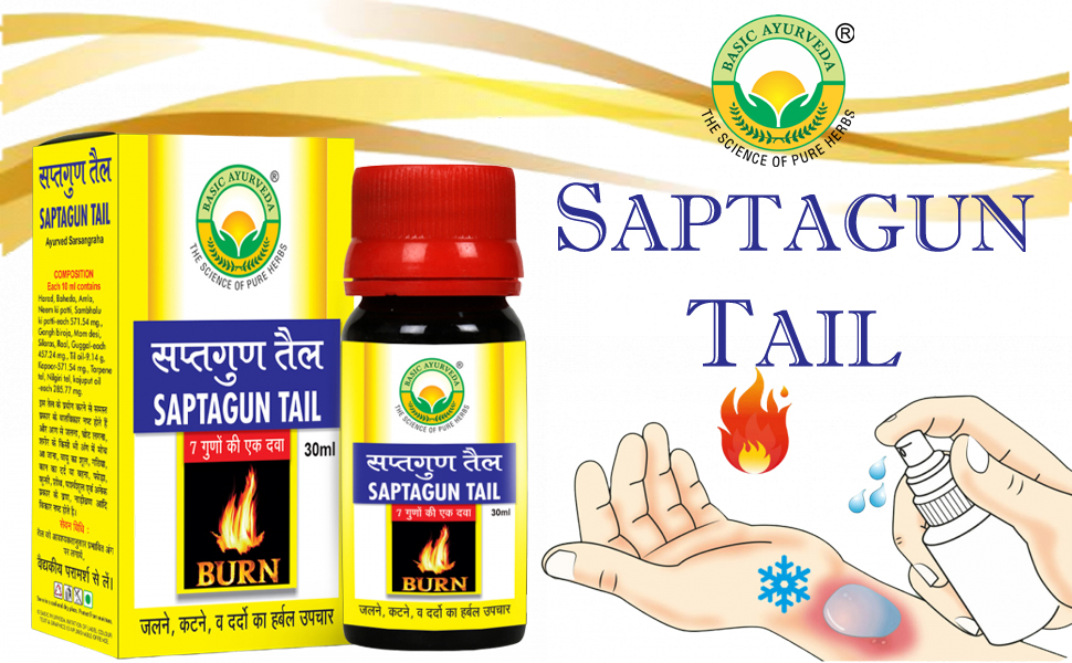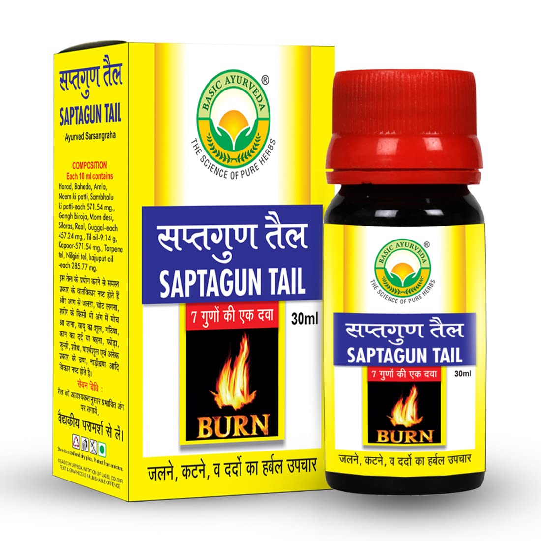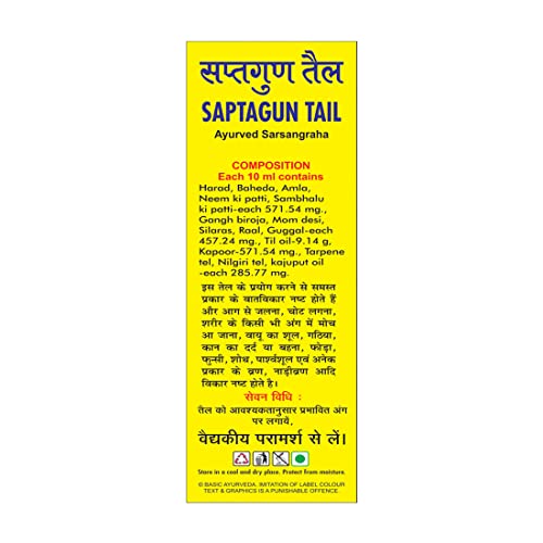 • Basic Ayurveda Saptgun Tail is made from Ayurveda ingredients like Harad Baheda Amla Neem ki Patti Sambhalu ki Patti Mom desi Gangh biroja Silaras Raal Til oil Kapoor Nilgiri tel Kajuput oil and other prominent herbs.