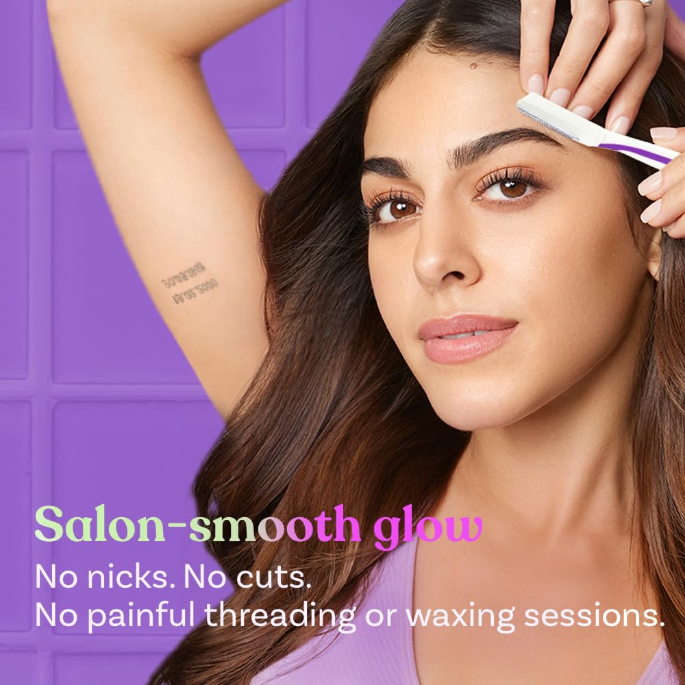 SALON-SMOOTH SKIN: Get parlor-finish for eyebrows forehead upper lips lower lips chin peach fuzz & sideburns with Bombae face razor KOREAN GLASS SKIN: Bombae facial hair remover for women exfoliates dry dead skin and primes skin for flawless makeup application EASY GRIP: Anti-slip grip with rust free and high precision blades for smooth shave without nicks and cuts GENTLE & PAINLESS: No nicks no cuts no pain with Bombae facial & upperlip hair removers for women AT-HOME BEAUTY RITUAL: Designed to be soft and gentle on all skin types - oily to combination. Shave every 5-7 days in case of normal growth & 3-4 days in case of accelerated hair growth