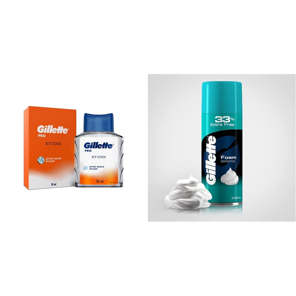 Gillette PRO AFTER SHAVE SPLASH ICY COOL 50ML WhiteLong Lasting Fragrance Gillette Series Icy Cool After Shave splash is matured and filtered for a long lasting fragrance and blended with moisturizers to tone your skin. Refreshes with a clean crisp masculine fragrance. Provides immediate relief after shaving and completes the shaving ritual. Apply to skin after shaving massaging gently to facilitate absorption and provide a refreshing cooling effect.Gillette Classic Sensitive Shave Foam - 418 g (33% extra)Simple.Honest.Classic. That's the Gillette Foam shave. The lightly fragranced for Sensitive Skin lather spreads easily and rinses clean for that Foam shave men have enjoyed for generations.