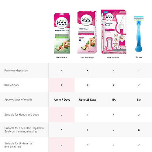Get the smooth skin and the freedom to wear any look any time with Veet. Veet Hair Removal Cream for Sensitive Skin enriched with Shea butter and Lily fragrance is the right solution when going to the salon is not an option. It effectively removes even short stubborn hair and leaves skin moisturized for up to 24 hours*. It can be used on legs arms bikini line and underarms for a perfectly finished hair-less skin. Veet Hair Removal Cream for Dry Skin gives you perfect hair removal results in 3-6 minutes. Follow the steps mentioned on the pack using the spatula provided. Before using the product please read pack precautions carefully. With regular use; get fewer finer and softer hair growing back!