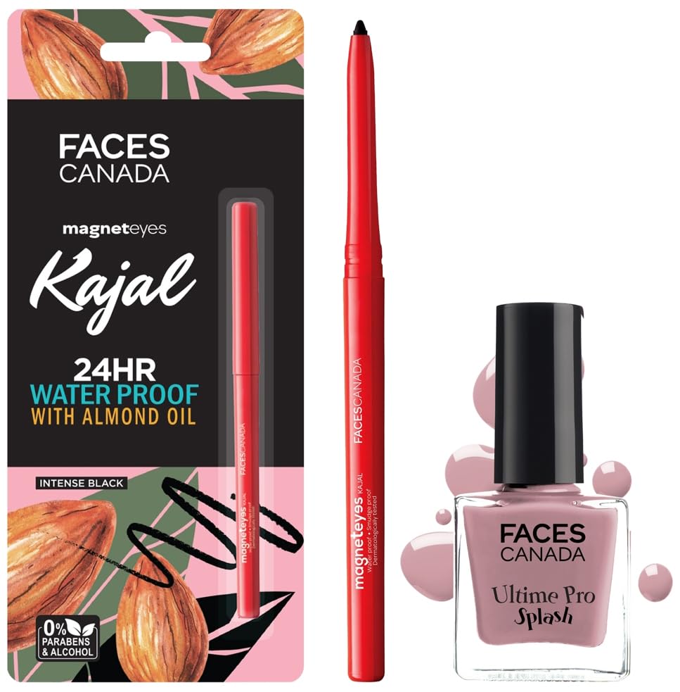 Faces Canada Magnet Eyes Kajal Waterproof 24hrs Long Stay Smudgeproof Fadeproof Almond Oil & Vit E enriched One Stroke Smooth Glide Black 0.35gThis new kajal is made with a unique smudge and fade proof formula is transfer resistant and keeps you stunning all day. Super soft and easy to apply this alluring kohl is loaded with antioxidants and minerals and is completely free of paraben.Faces Splash Glossy Nail Enamel Floral Dream 56 8 mlGet this long lasting nail polish for you. This one is ideal for nail polish lovers.