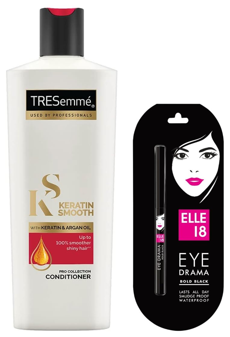Elle 18 Eye Drama Kajal Bold Black 0.35gAdd more charm to your eyes with this Elle 18 Eye Drama from Elle 18. The Elle 18 Eye Drama is long lasting Kajal in a twist-up format. This dermatologically tested kajal is just what you need for completing your eye makeup or carrying a simple only-kajal look. It's a smudge proof water proof kajal and can add the dramatic and glamorous look to your eyes. It has intense matte texture and you can experiment with a thin line or a bold wing this kajal is great for day and night looks. Its long-lasting- up to 12 hours without smudging and is completely water proof. It is designed with an easy to use and convenient twist-up format. Just one stroke of the Elle 18 Eye Drama enhances your simple look to a more stylish avatar. You are incomplete without Elle 18 Eye Drama and this is a perfect everyday product! Get the Elle 18 Eye Drama in black now. The Elle 18 Eye Drama goes best with your looks further be it a wedding party and work look. Line your upper and lower eyelid with a rich coat of the Elle18 Eye drama Kajal. Draw from the inner corner towards the outer corner and join the line to form an upward wing. Its size and moisturizing properties makes this the perfect travel kajal for everyday use. Buy Now!TRESemme Keratin Smooth Conditioner 190mlLaunched in 1948 TRESemmé was named after renowned hair care expert Edna Emmé. Up until the 1950's TRESemmé was sold only in salons. Today it is available at a shop near you so that you can have salon style hair at home. For over 60 years TRESemmé has built a history of success in 13 countries around the world. From its origins in 1947 and salon expertise TRESemme has been driven by a simple truth: every woman deserves to look & feel fabulous like she has just stepped out of the salon everyday. This range has been carefully selected for its advanced formula. Driven by our salon heritage we work with our stylists to deliver expert solutions from salon quality products without the salon price tag. Our salon inspired products enriched with high quality ingredients help you experience that salon feeling everyday. TRESemme Keratin Smooth Conditioner helps restore keratin and nourishes each strand to leave hair gorgeously straighter shinier and more manageable. When used together with Keratin Smooth Shampoo it controls frizz for up to 48 hours and transforms your hair to be gorgeously straighter more manageable and easy to style. For best results use after the TRESemme keratin smooth shampoo.