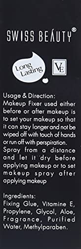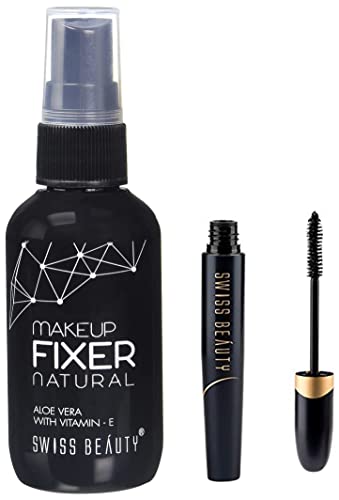 Swiss Beauty Long lasting Misty Finish Professional Makeup Fixer Spray for Face makeup | With Aloe Vera and Vitamin- E | Light weight quick dry makeup Setting spray |70 ML|Makeup fixer used either before or after makeup is to set your makeup so that it can stay longer and not be wiped off with touch of hands or run off with perspiration. Spray from a distance and let it dry before applying makeup or to set makeup or to set makeup spray after applying makeup.Swiss Beauty Bold Eye Super Lash Waterproof Mascara Eye Makeup Black-01 7.5MlSwiss Beauty bold eyes super lash mascara the perfect complement to a smokey eye look This kohl - pigmented mascara delivers high drama by creating extremely black stretched-out lashes in an instant. Plus the long-wearing formula holds its own against flaking smudging sweat and humidity.