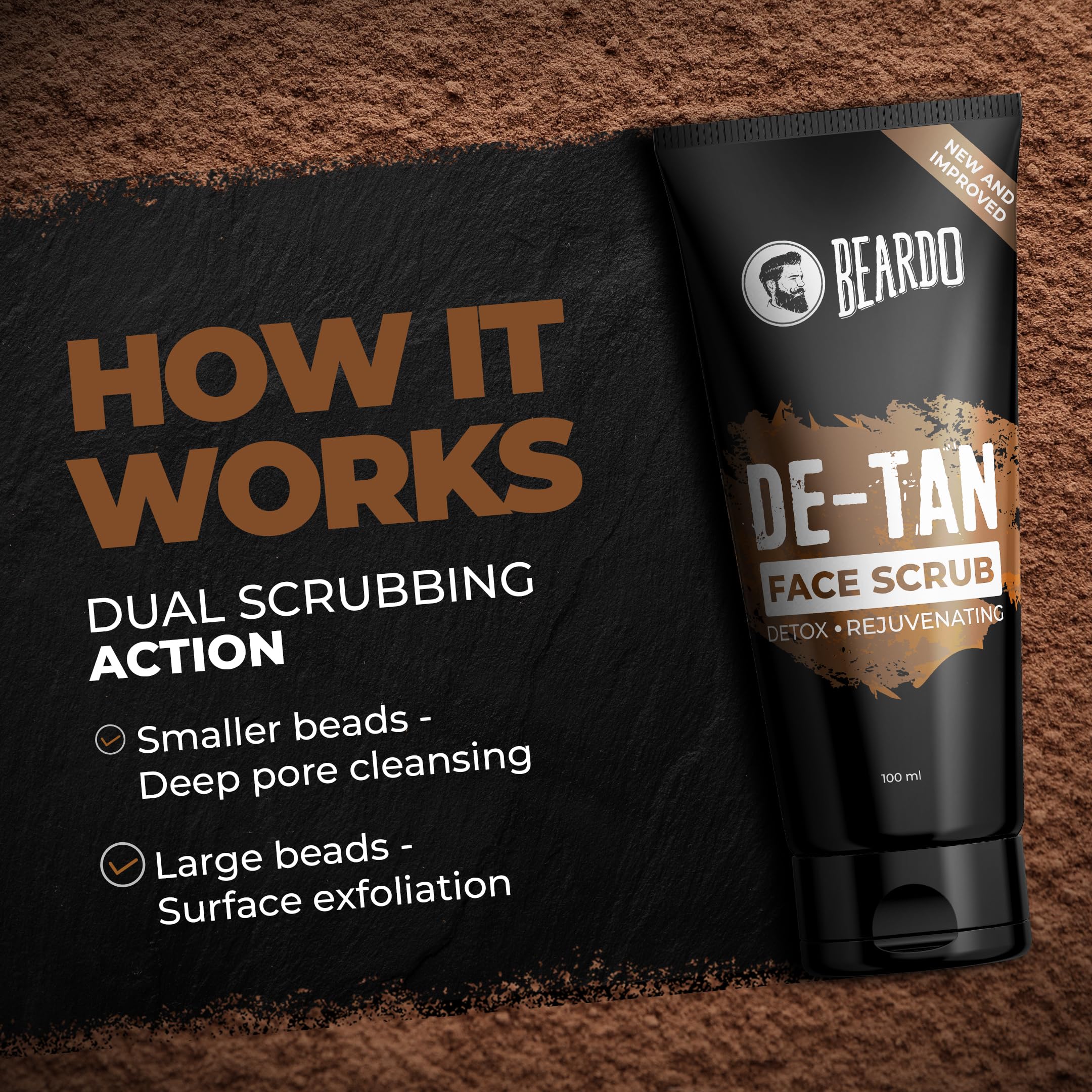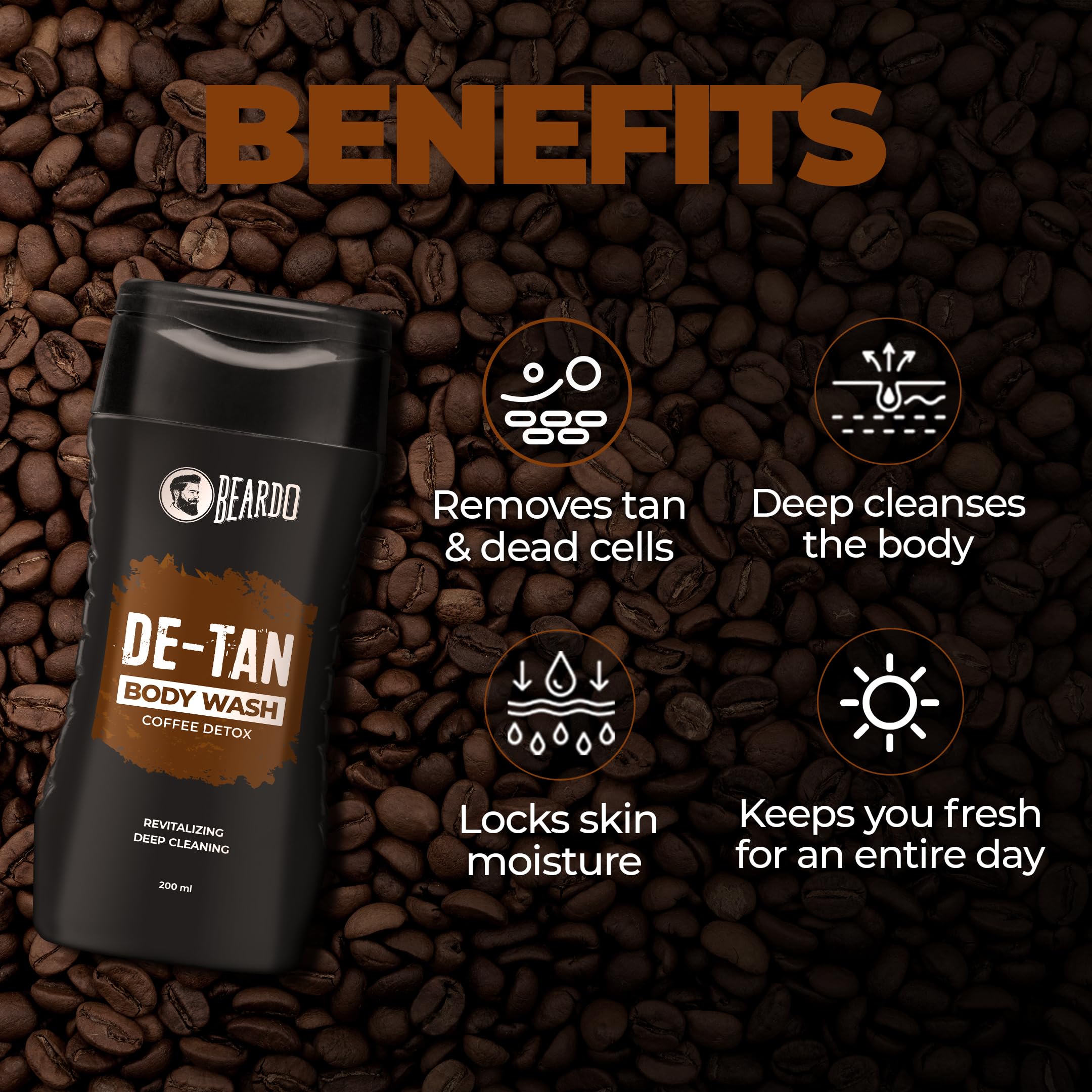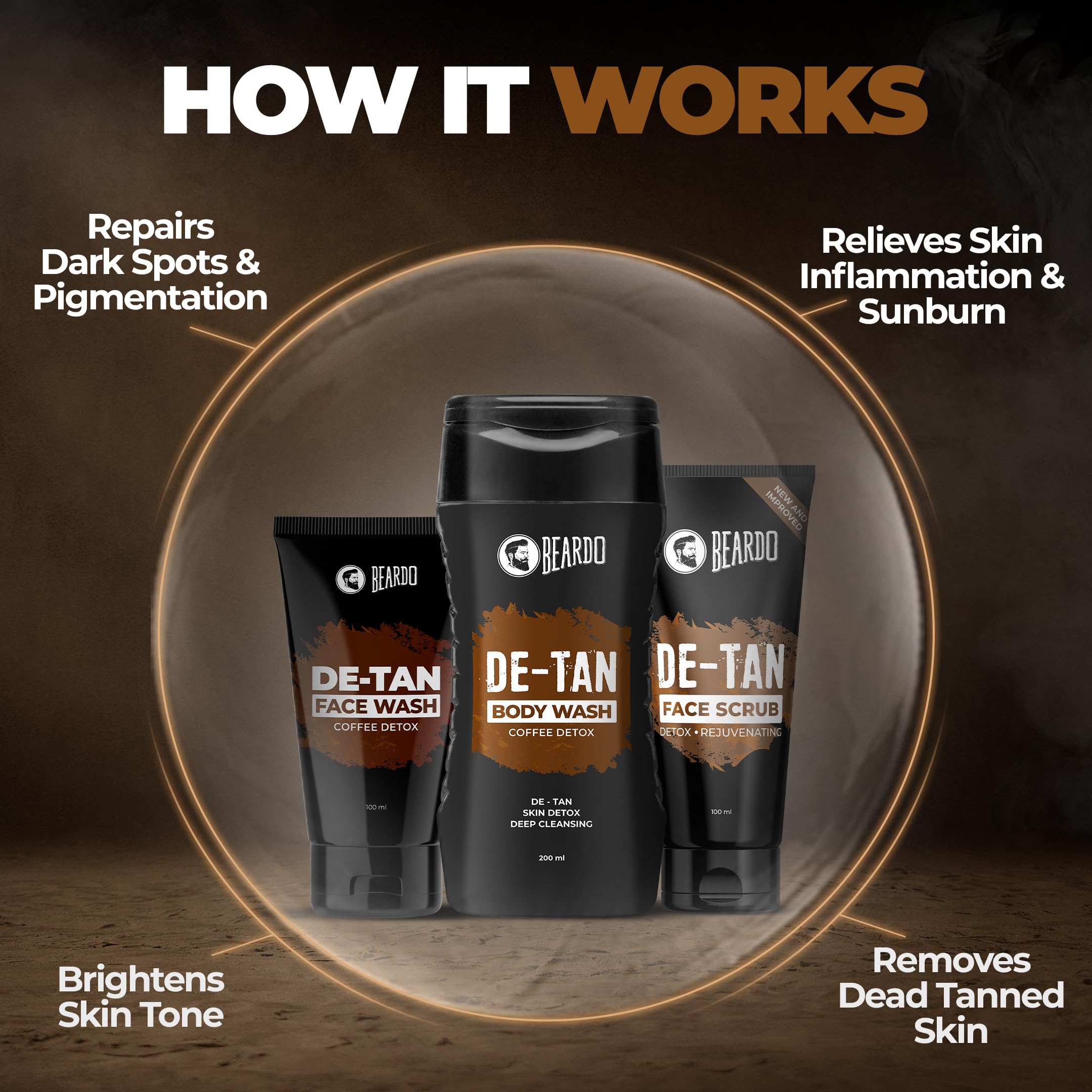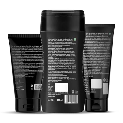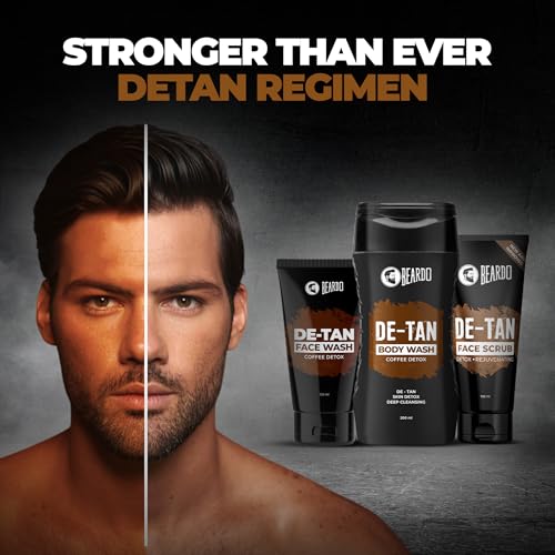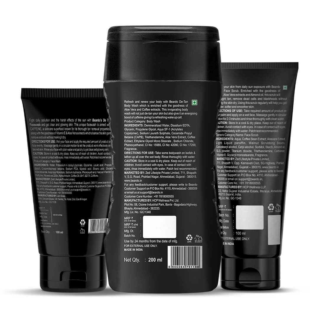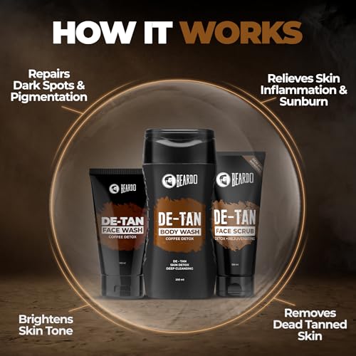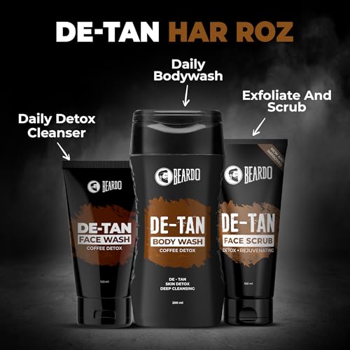 BEARDO De-Tan Face wash for Men 100ml | Reduces Tan for glowing complexion | Coffee Facewash | Dark Spot Reduction | Tan removal face wash menRetain your shade in sun let's face it we cannot avoid the sun. We need to go out in the sun be it for work or travel but the strong sunlight and UV rays can be harsh to our skin and regular exposure to sun and dust can lead to tanning and other skin issues. But as always BEARDO is here to rescue you from the unwanted tan BEARDO De-Tan face wash. Enriched with natural aloe vera extracts and vitamin e this face wash will not only cleanse your skin but will also heal it nourish it and De-Tan it without making it dry. By using this face wash regularly your skin will have a clear and glowing complexion you've always wanted.Beardo De-Tan Body Wash for Men 200ml | Tan Removal| Caffeine Body Wash | With Coffee & Aloe Extracts | For Body & Face | Refreshing FragranceRefresh and renew your entire body with the all new BEARDO De-Tan body wash which is enriched with the goodness of aloe vera and coffee extracts. We all know about the healing and soothing properties of aloe BEARDO detan body wash imbibes the goodness of aloe and brightening effects of coffee to vitalize your skin with its natural glow.BEARDO De-Tan Face scrub for Men 100ml | Blackhead & Tan Removal | Dual Bead Exfoliation | Coffee Detox | Oil Control | Dark Spot reduction | for MenBeardo caffeine facial scrub is specially designed for men and it works wonders on men's tough skin to remove dead skin cells dirt and blackheads while regenerating skin cells for a young glow and a new look.