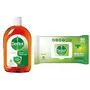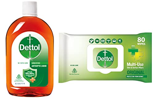 Dettol Disinfectant Sanitizer Wet Wipes for Skin & Surfaces Original â 80 Count| Moisture-Lock Lid | Safe on Skin | Ideal to Clean SurfacesDettol's Disinfecting Skin & Surface Wipes are Safe on Skin Ideal to Clean Multiple Surfaces Easy to carry with a resealable Moisture-lock lid. Dettol disinfecting wipes are practical for everyday use on furniture taps sinks door knobs kitchen bathroom surfaces floor cleaning childrenâs surfaces and places that are germ hotspots. It can be used on most hard non-porous surfaces including Finished Wood Sealed Marble Stainless Steel Laminated Floors Glass and Plastic.Dettol Antiseptic Liquid for First Aid Surface Disinfection and Personal Hygiene 250mlDettol Antiseptic Liquid protects you and your family from 100 illness causing germs. It comes in a fresh pine fragrance. The topical antiseptic liquid sanitizes your home and helps maintain your personal hygiene. The Dettol first aid antiseptic liquid can be used to protect against infection from cuts and scratches disinfect toys and sanitize baby wear leaving everything clean and fresh. It can also be used as a household disinfectant and cleaner on surfaces or in laundry cleaning to kill germs. This liquid antiseptic is recommended by Indian Medical Association and can be kept in your emergency first aid kit. USAGE: Recommended dilutions to protect your family from germs: Bathing â 5ml to a bucket of water (10 litres); First Aid- 15ml to 300ml of water; Shaving Antiseptic Liquid- 15ml to 300ml of water; Nappy Wash â 12.5ml to 500ml of wate