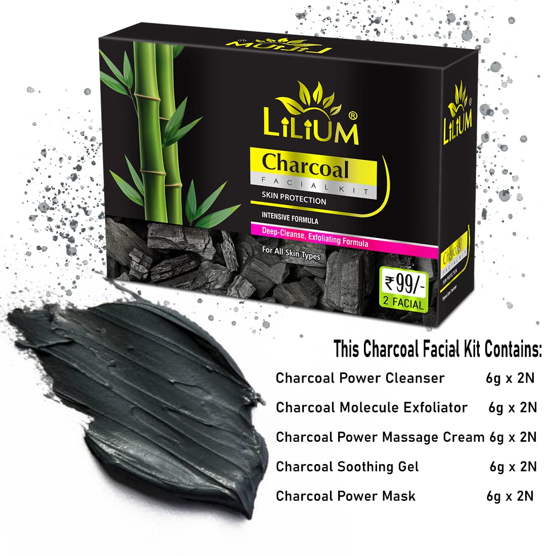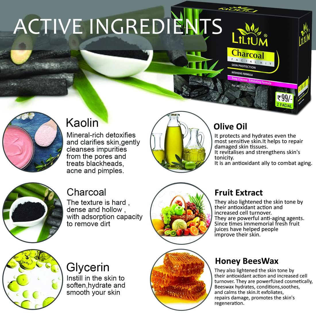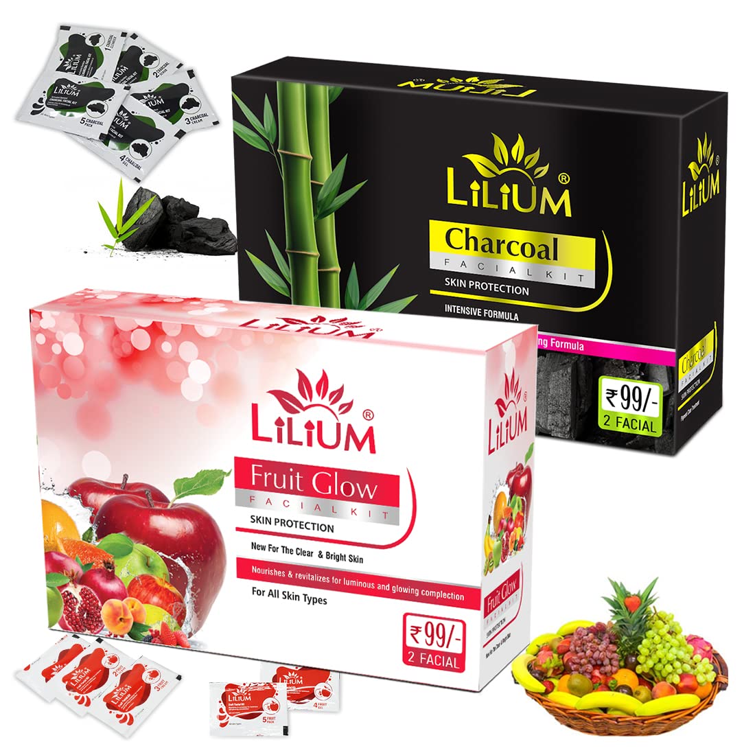Lilium Charcoal Facial Kit Deep-Cleanse Exfoliating Formula & Fruit Facial Kit Nourishes & Revitalizer For Luminous and Glowing Complection 60g