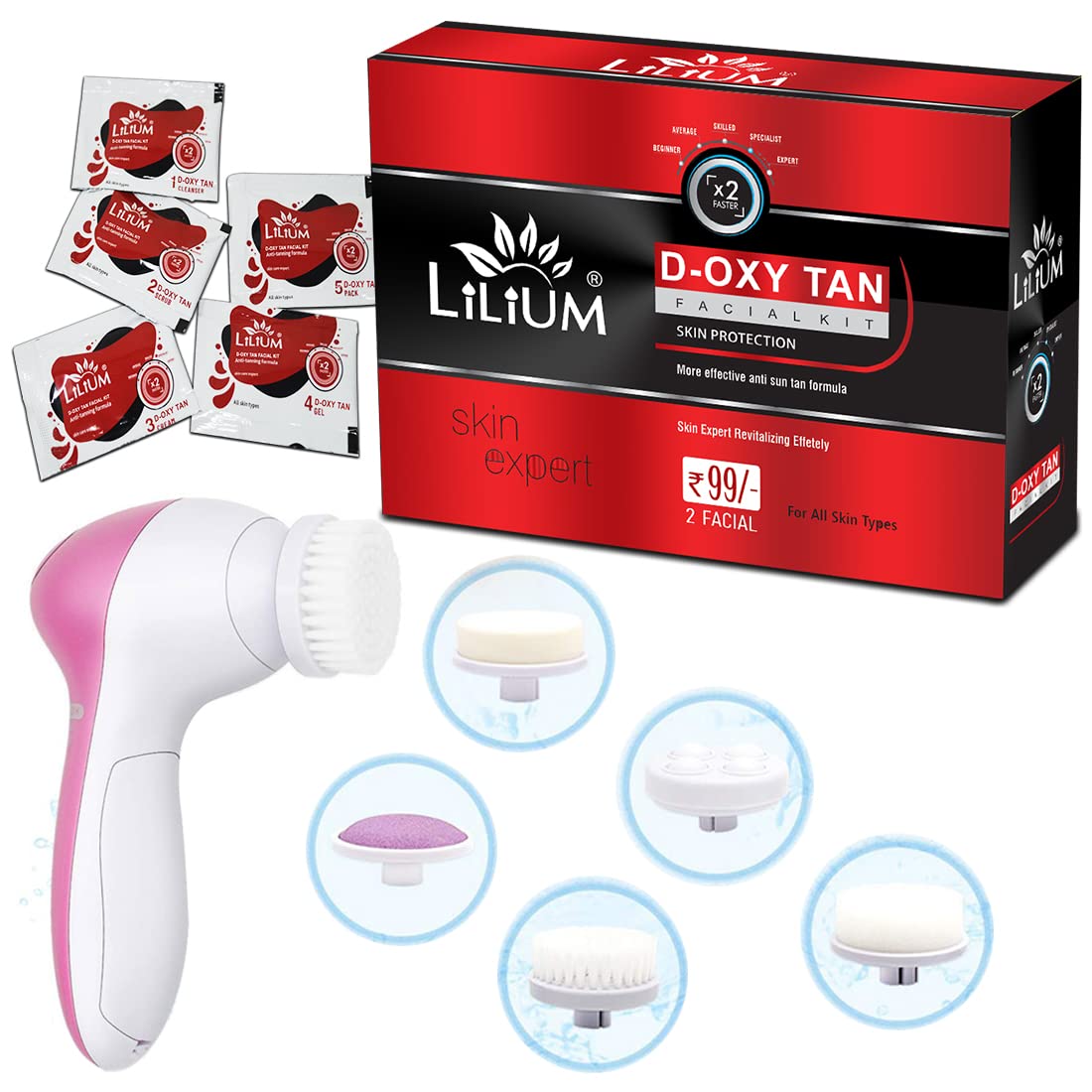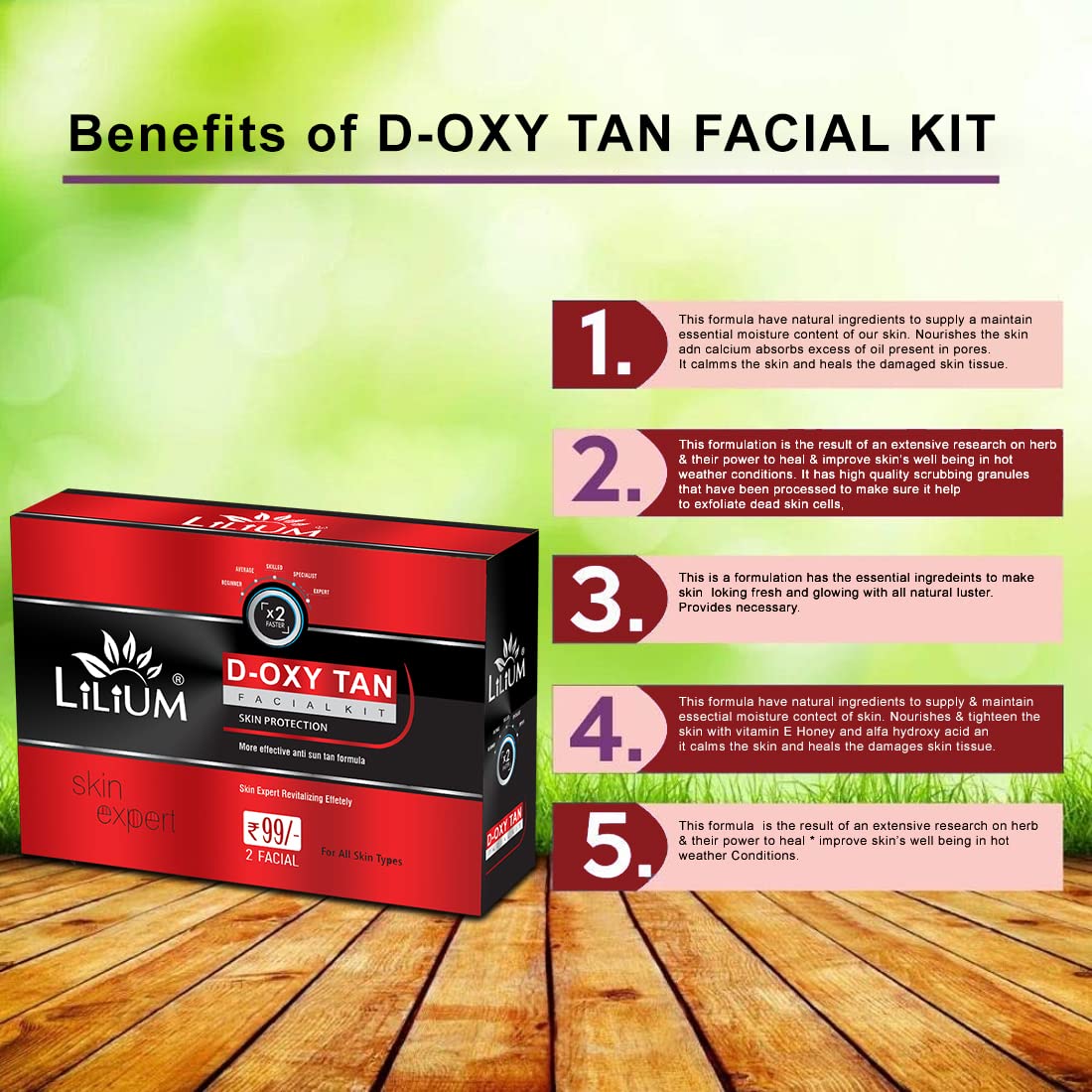 Buy this Product From The House Of Good Choice India on Amazon.in The Lilium D-Oxy Tan Facial Kit" fortified with Actives is a complete "Do it yourself" Facial Kit that can be used at the comfort of your home. In today’s day and age exposure to Sun Pollution and Impurities in our surroundings leaves our skin dull dark and lifeless! Maintaining good skin health is the top most priority for all of us! D-Oxy Tan Facial Kit" helps tackle these skin concerns. Enriched with the concoction of Activated with natural ingredients that are fortified with Actives delivers maximum efficacy with skin rejuvenation benefits for a purified balanced and glowing skin! This kit is suitable for skin types.