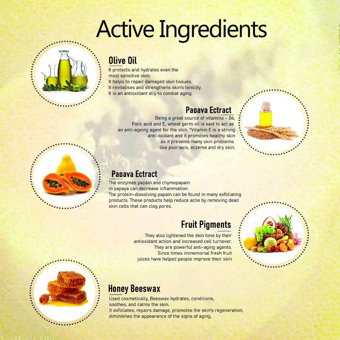 • Papaya Cleanser: This formula have natural ingredients to supply a maintain essential moisture content of our skin. Nourishes the skin and calcium absorbs excess of oil present in pores. It calms the skin and heals the damaged Skin tissue. It is a hydrato