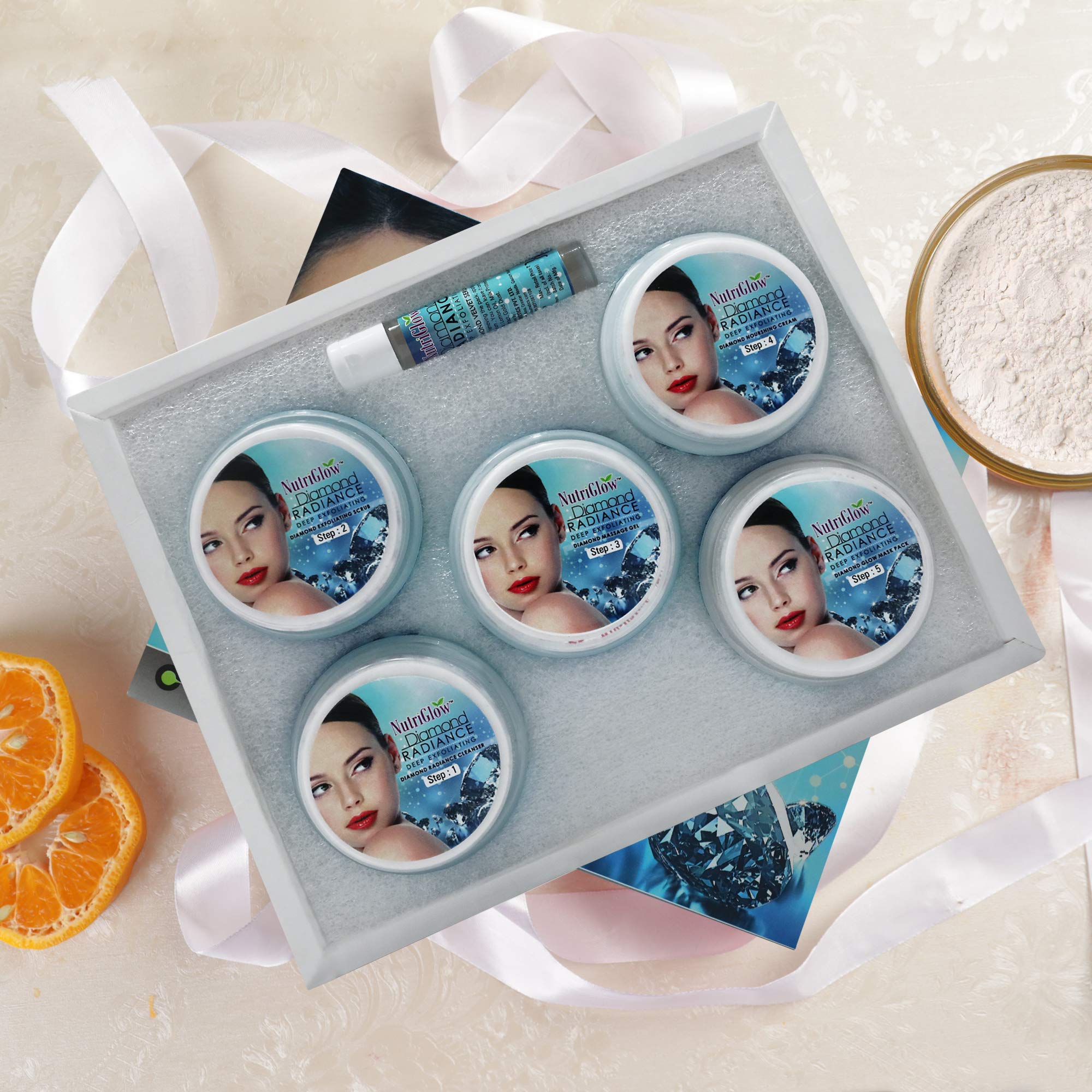 NutriGlow isn't just a brand name. It is truly a commitment to bring out the purest healthiest products and educating every individual on why organic self-care is so important. We strive to live with compassion kindness and empathy to create something radically new through safe & potent formulas. Most importantly we believe in the power of nature to bring tangible results keeping the toxic chemicals aside. Ensuring that no animals are harmed in the making of our products is our main concern. We are glad to inform our valuable customers that all our products have natural raw ingredients and we do not use fillers of any kind. Every Ingredient that we include in our product is there for a particular therapeutic reason. Our products are never tested on animals and don't exploit anyone in making them. We aim towards more sustainable packaging through the use of recycled plastic and responsibly packaging. Today more and more brands are following in our footsteps and we are glad to welcome them aboard. The world needs it. It's time to give your skin the nourishment it deserves! Infused with the goodness of pure and effective ingredients this facial kit gently exfoliates parched skin to reveal smoother cleaner and more radiant skin. So ladies! Head over to flaunt your beautiful skin with this exclusive range of cruelty-free vegan and nature-inspired product that you are sure to love. 1. Get that flawless skin all year round with Diamond Radiance Facial kit 2. Rejuvenate your skin with Diamond Radiance Facial kit 3. Hydrate and add glow to your skin with Diamond Radiance Facial kit 4. Hydrate and protect your skin's natural moisture with Diamond Radiance Facial kit