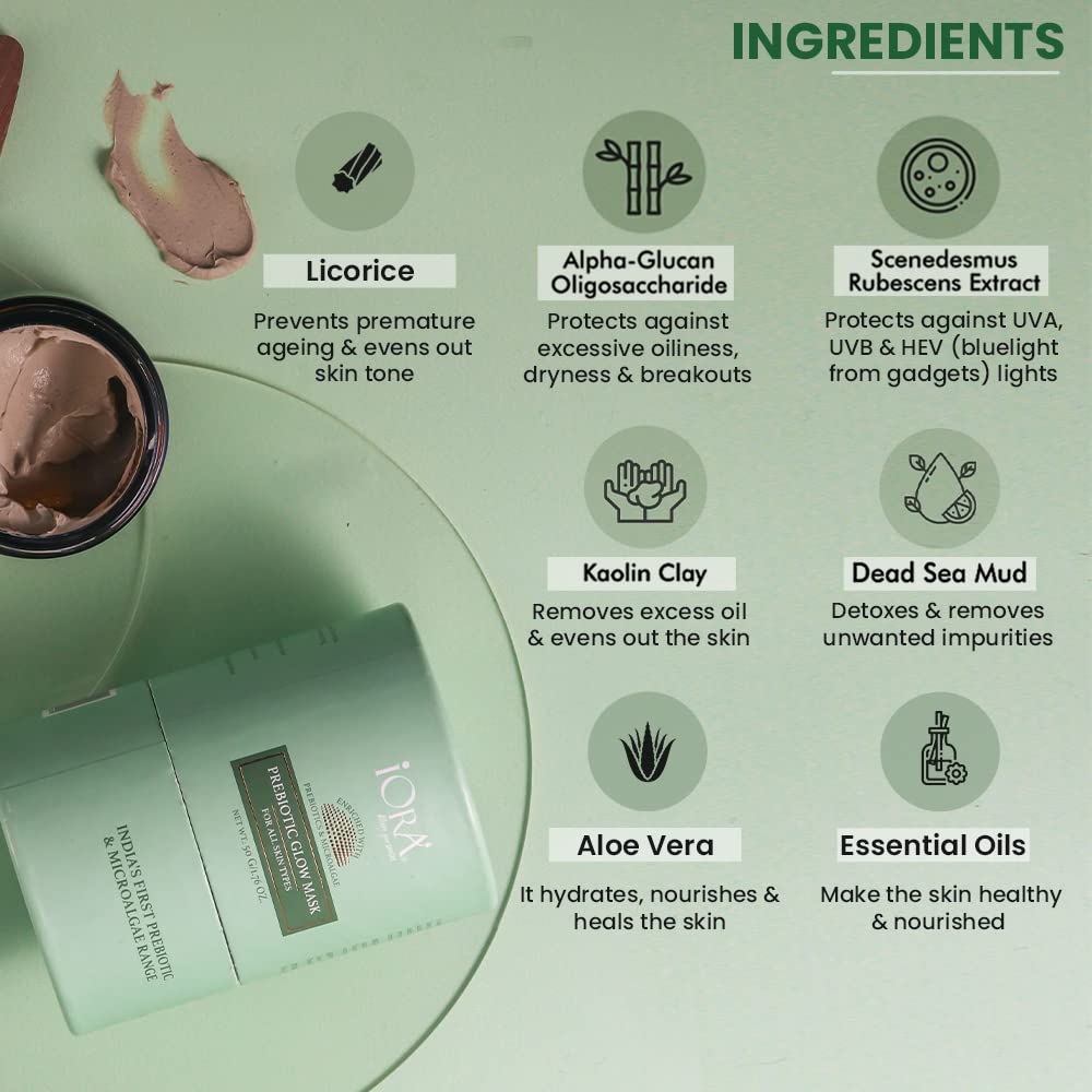 iORA Prebiotic Glow Mask | Get Radiant & Glowing Skin - Helps with Tan Removal & Skin Brightening | Aloe Vera Essential Oils Dead Sea Mud & Kaolin Clay | Clay Mask for All Skin Types - Men & Women