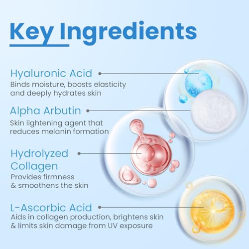 • KEY INGREDIENTS: L-Ascorbic Acid (Vitamin C) Alpha Arbutin Hydrolyzed collagen Hyaluronic Acid Multifruit BSC Ferulic Acid