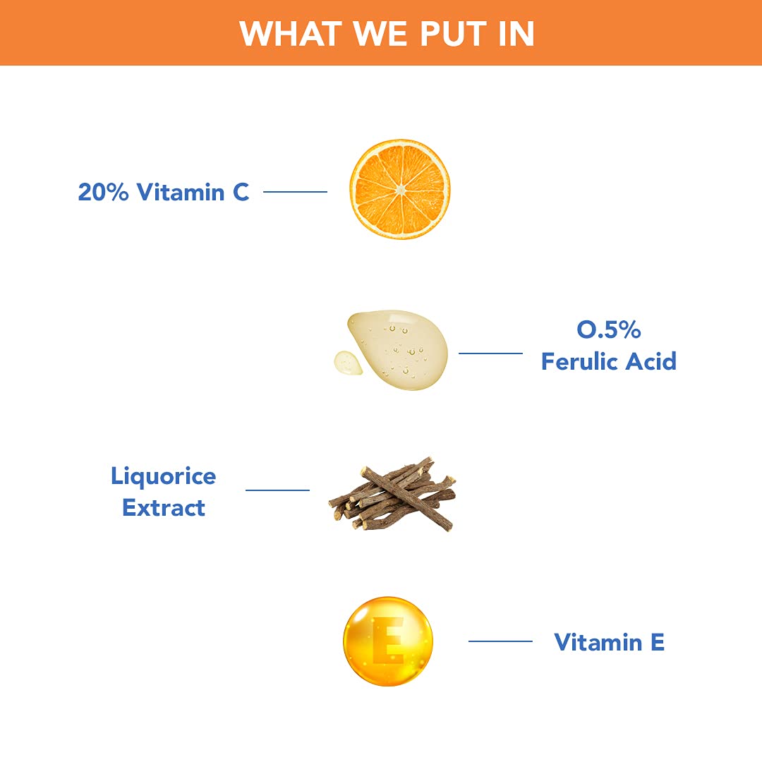 The Moms Co. Natural Vitamin C Face Serum promotes surface cell turnover for a naturally brighter and even toned skin. With 10% Vitamin C 0.5% Ferulic Acid Squalene this powerful formula helps lighten dark spots to reveal a naturally brighter looking skin. The formula penetrates deep into skin to act from within. The product is made with non-comedogenic ingredients and is dermatologically tested.
