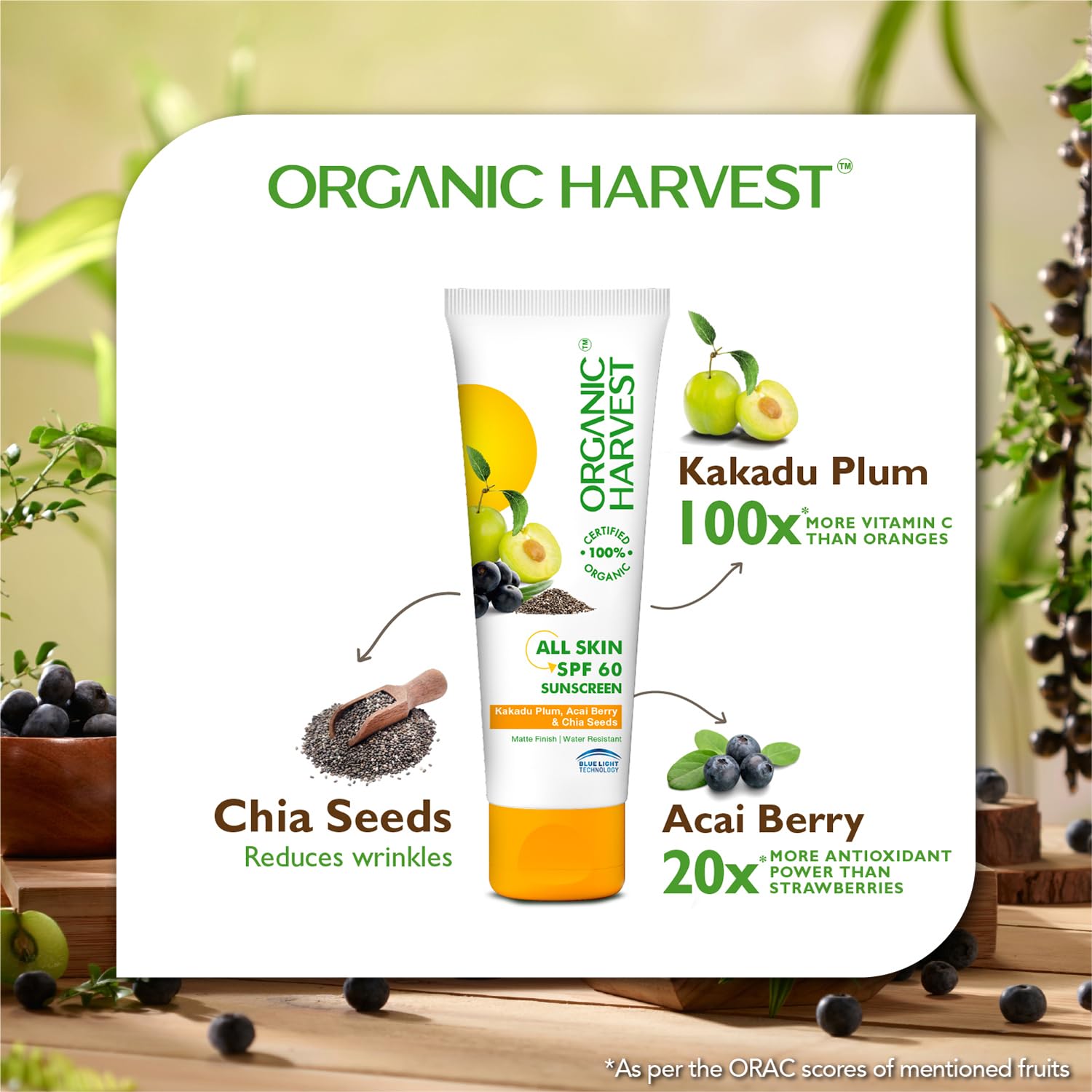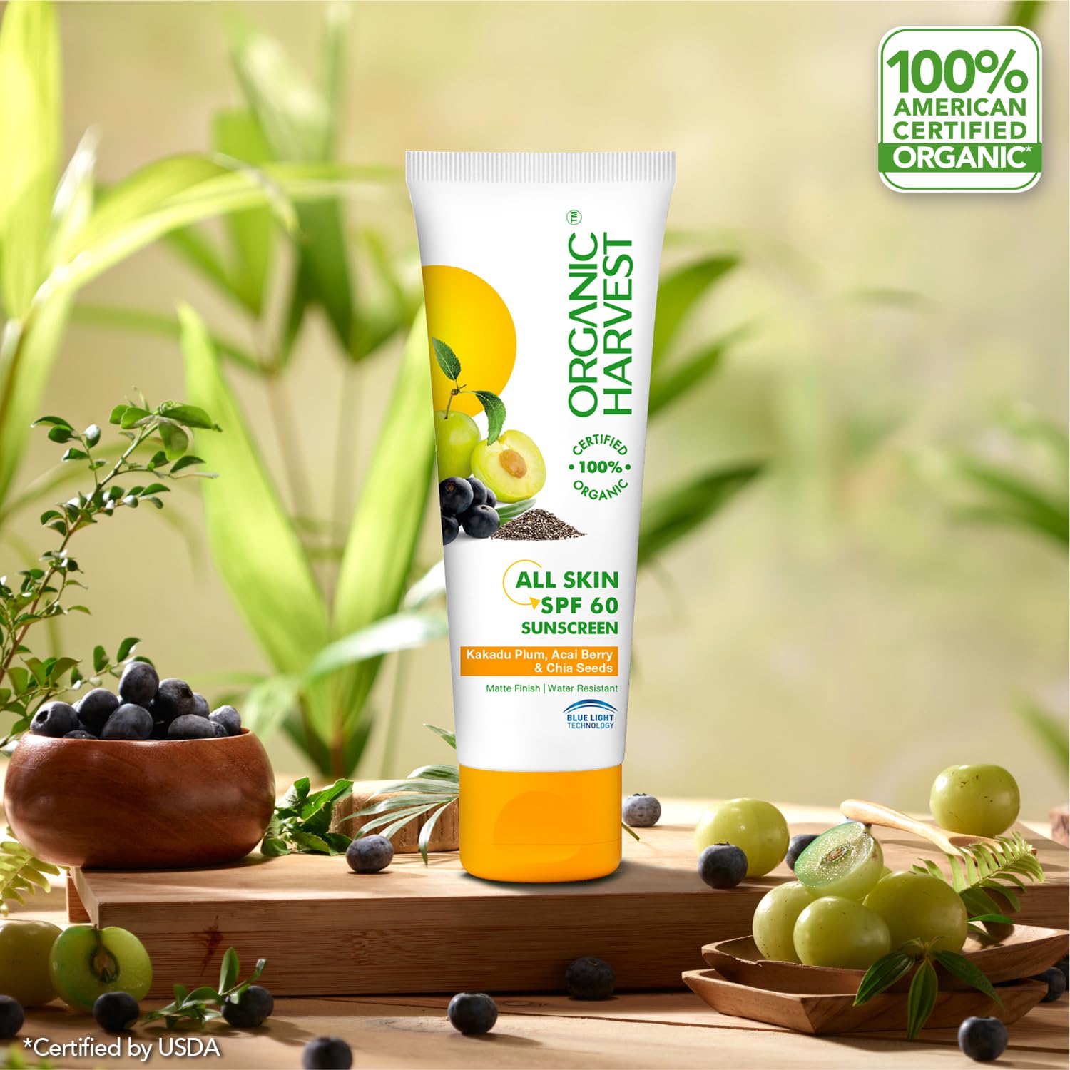 Organic Harvest All Skin Sunscreen SPF 60 PA+++ | Certified Organic | Hybrid Sunscreen | Vitamin C | For Dry & Oily Skin | Broad Spectrum UVA-UVB & Blue Light Protection | Women & Men - 100g
