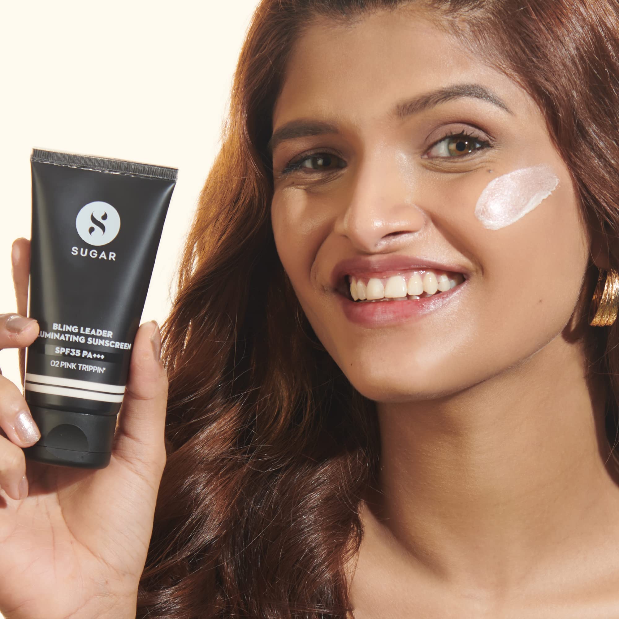 • ALL-DAY SUN PROTECTION: SUGAR Cosmetics Bling Leader Illuminating Sunscreen offers SPF35 PA+++ protection shielding your skin from harmful UV rays throughout the day.