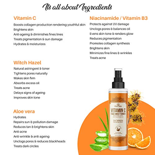 Energize and refresh your skin instantly with Matra Vitamin C Face Mist Toner! Developed with a gentle alcohol-free formula this glow boosting toner is infused with soothing yet powerful skin ingredients like vitamin C niacinamide (vitamin B3) witch hazel and aloe vera. This face mist toner will deeply cleanse and tone the skin tightening pores and rendering it a refreshed glow. Use this powerhouse toner as a part of your daily skincare regimen after cleansing or as a face mist spray at any time of the day to rejuvenate and brighten up skin instantly.