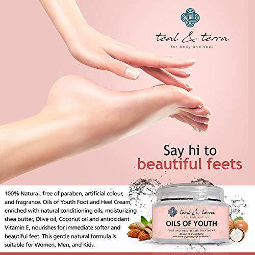 With 100% Organic Cold-Pressed Sweet Almond and Coconut Oils a nourishing foot and heel cream that dryness and cures broken and chapped skin. Its regular improves skin elasticity with a natural antioxidant solution to patch cracked feet. Blended with deep penetrating Shea Butter Vitamin E and Olive Oil it helps smooth dry hard heels and callous skin. Glycerine and natural amino acid acts to hydrate and defend against germs and contaminants as a protective antiseptic agent. Handpicked essential oils revive and invigorate sore feet. Cheers to happy beautiful and soft feet!