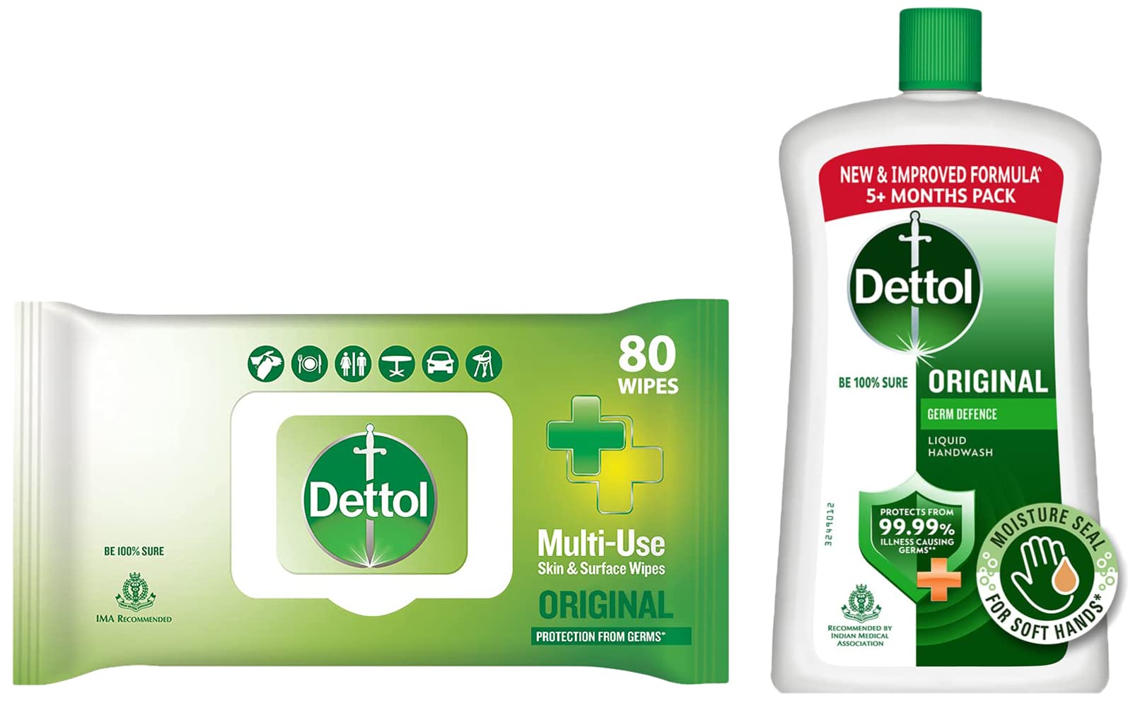 Dettol Disinfectant Sanitizer Wet Wipes for Skin & Surfaces Original â 80 Count| Moisture-Lock Lid | Safe on Skin | Ideal to Clean SurfacesDettol's Disinfecting Skin & Surface Wipes are Safe on Skin Ideal to Clean Multiple Surfaces Easy to carry with a resealable Moisture-lock lid. Dettol disinfecting wipes are practical for everyday use on furniture taps sinks door knobs kitchen bathroom surfaces floor cleaning childrenâs surfaces and places that are germ hotspots. It can be used on most hard non-porous surfaces including Finished Wood Sealed Marble Stainless Steel Laminated Floors Glass and Plastic.Dettol Liquid Handwash Refill - Original Germ Protection Hand Wash- 900ml | Antibacterial Formula | 10x Better Germ ProtectionBe 100% sure to protect your skin from 100 illness-causing germs and bacteria. Use Dettol's Original Germ Protection Handwash Liquid Soap pH balanced formula every day and keep your hands hygienically clean and refreshed. This hand wash provides soft and rich lather leaving behind clean hands and mild pine fragrance. The trusted germ-protection modus operandi acts like a barrier between your hands and a wide range of unseen germs. The soap-free formula with glycerin makes sure to keep your skin moisturised while the plant derived cleansers help ensure thorough cleaning. Dettol handwash also contains more than 85% naturally derived ingredients with no TCC & Triclosan giving another healthy reason for hand washing whenever in need. Wash hands properly with Dettol and help keep your family healthy! Safety Information: Keep out of reach of children unless under adult supervision. Avoid direct contact with eyes. For external use. In case of contact with eyes rinse immediately with plenty of water. If persistent irritation occurs seek medical attention.