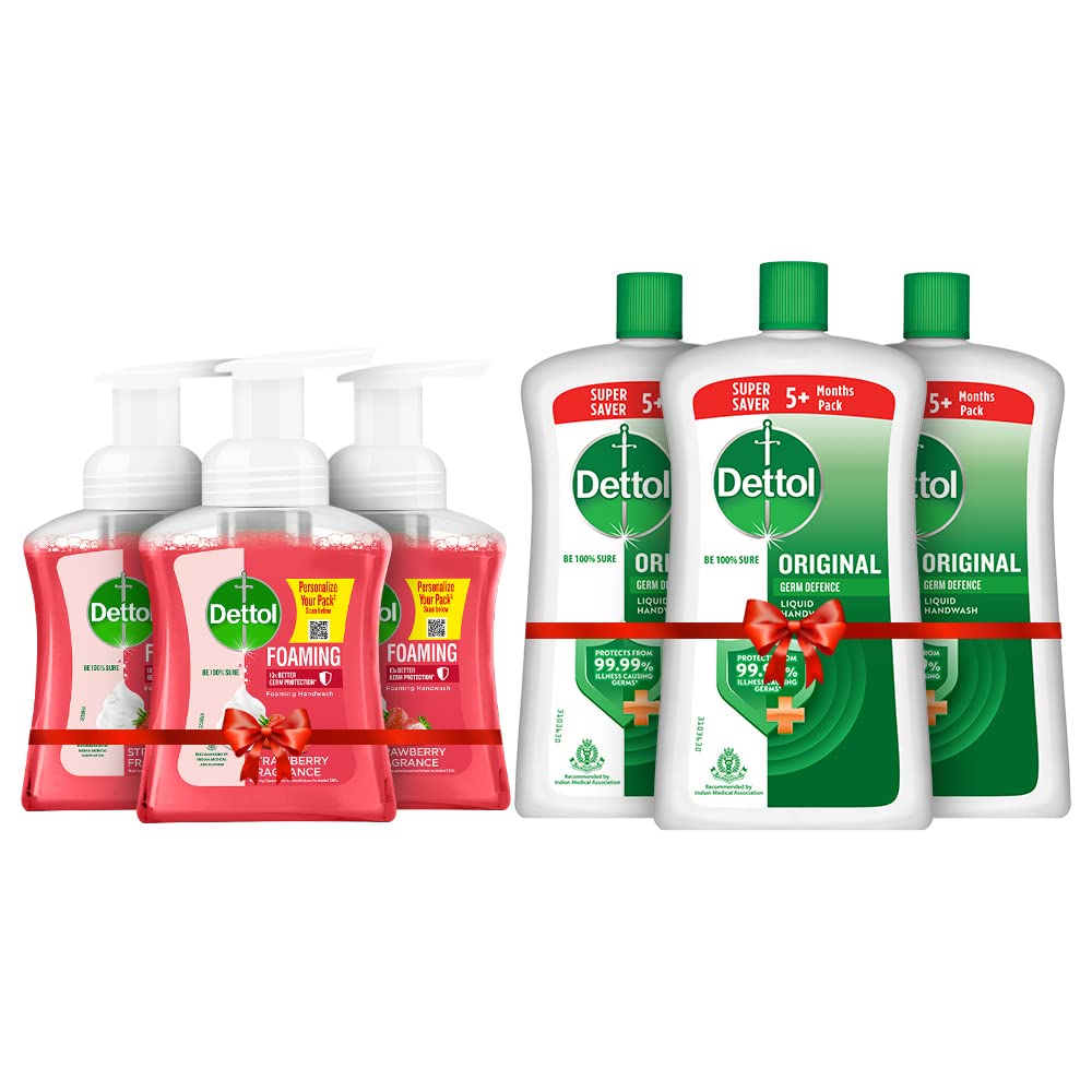 Dettol Foaming Handwash Pump - Strawberry (Pack of 3-250ml each) | Rich Foam | Moisturizing Hand Wash | Soft on HandsBe 100% sure to protect your skin from germs and bacteria. Dettol foaming handwash is a moisture-rich foam that removes dirt and germs while being gentle on skin. This hand wash provides soft and rich lather leaving behind clean hands and mild strawberry fragrance. Dettol handwash is dermatologically tested. Dettol handwash are free from parabens/ TCC and are ph balanced.Dettol Liquid Handwash Refill Bottle - Skincare Moisturizing Hand Wash (Pack of 3 - 900ml each) | Antibacterial Formula | 10x Better Germ ProtectionBe 100% sure to protect your skin from 100 illness-causing germs and bacteria. Use Dettol's Skincare Germ Protection Handwash Liquid Soap pH balanced formula every day and keep your hands hygienically clean and refreshed. This hand wash provides soft and rich lather leaving behind clean hands and fragrance. The trusted germ-protection modus operandi acts like a barrier between your hands and a wide range of unseen germs. The soap-free formula with glycerin makes sure to keep your skin moisturised while the plant derived cleansers help ensure thorough cleaning. Dettol handwash also contains more than 85% naturally derived ingredients with no TCC & Triclosan giving another healthy reason for hand washing whenever in need. Wash hands properly with Dettol and help keep your family healthy! Safety Information: Keep out of reach of children unless under adult supervision. Avoid direct contact with eyes. For external use. In case of contact with eyes rinse immediately with plenty of water. If persistent irritation occurs seek medical attention.
