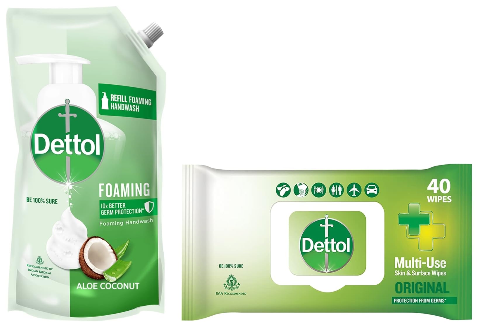 Dettol Foaming Handwash Refill - Aloe Coconut 700ml | Rich Foam | Moisturizing Hand Wash | Soft on HandsBe sure to protect your skin from germs and bacteria. Dettol foaming handwash is a moisture-rich foam that removes dirt and germs while being gentle on skin. This hand wash provides soft and rich lather leaving behind clean hands and mild aloe coconut fragrance. Dettol handwash is dermatologically tested. Dettol handwash are free from parabens/ TCC and are ph balanced.Dettol Germ Protection Wet Wipes for Skin & Surfaces Original - 40 Count|| Moisture-Lock LidDettol's Disinfecting Skin & Surface Wipes are Safe on Skin Ideal to Clean Multiple Surfaces Easy to carry with a resealable Moisture-lock lid. Dettol disinfecting wipes are practical for everyday use on furniture taps sinks door knobs kitchen bathroom surfaces floor cleaning childrenâs surfaces and places that are germ hotspots. It can be used on most hard non-porous surfaces including Finished Wood Sealed Marble Stainless Steel Laminated Floors Glass and Plastic.