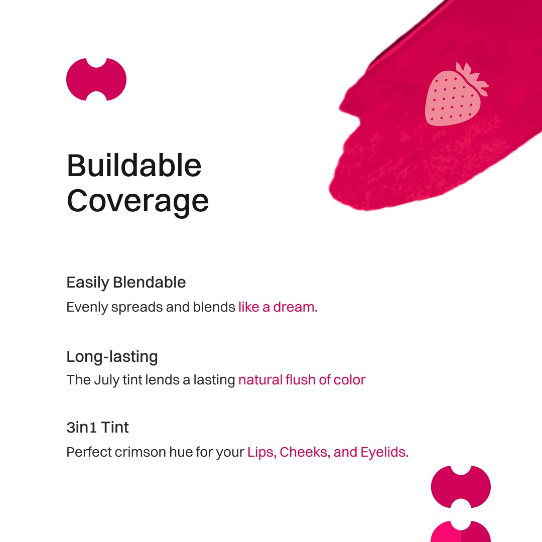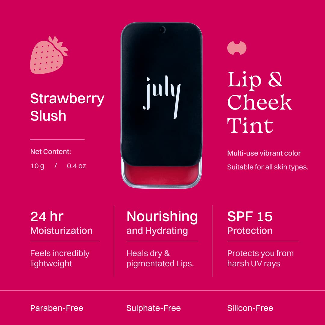 July Strawberry Slush Lip & Cheek Tint | 3in1 for Lips | Cheeks & Eyelids | SPF 15 | 24 hr Moisturization | Vibrant Creamy Matte | with Jojoba Seed Oil & Sweet Almond Oil | 10gm (Crimson)