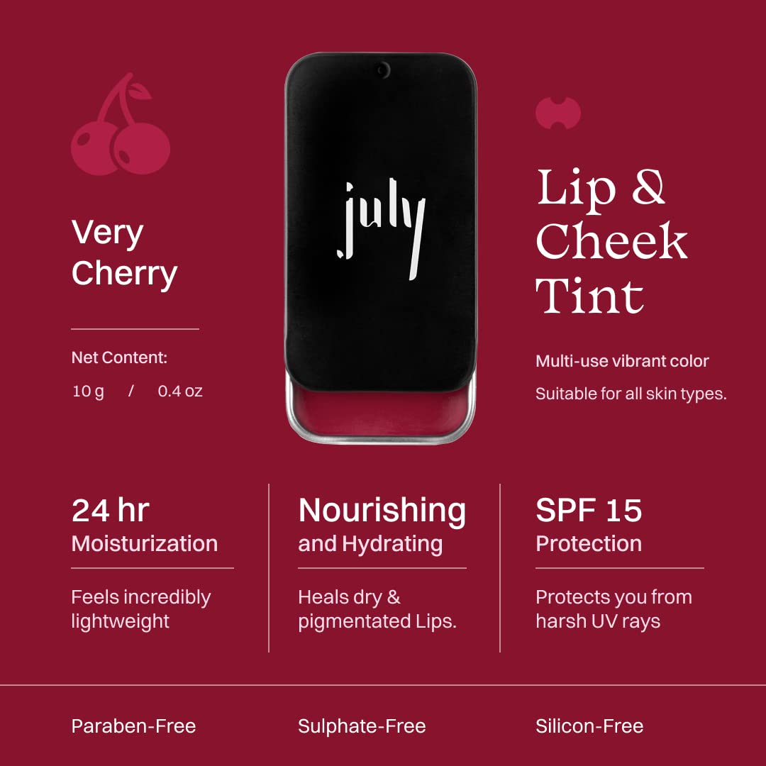July Very Cherry Lip & Cheek Tint | 3in1 Tint for Lips | Cheeks & Eyelids | SPF 15 | 24 hr Moisturization | Vibrant Creamy Matte | Enriched with Jojoba Seed Oil & Sweet Almond Oil | 10gm (Deep Ruby)