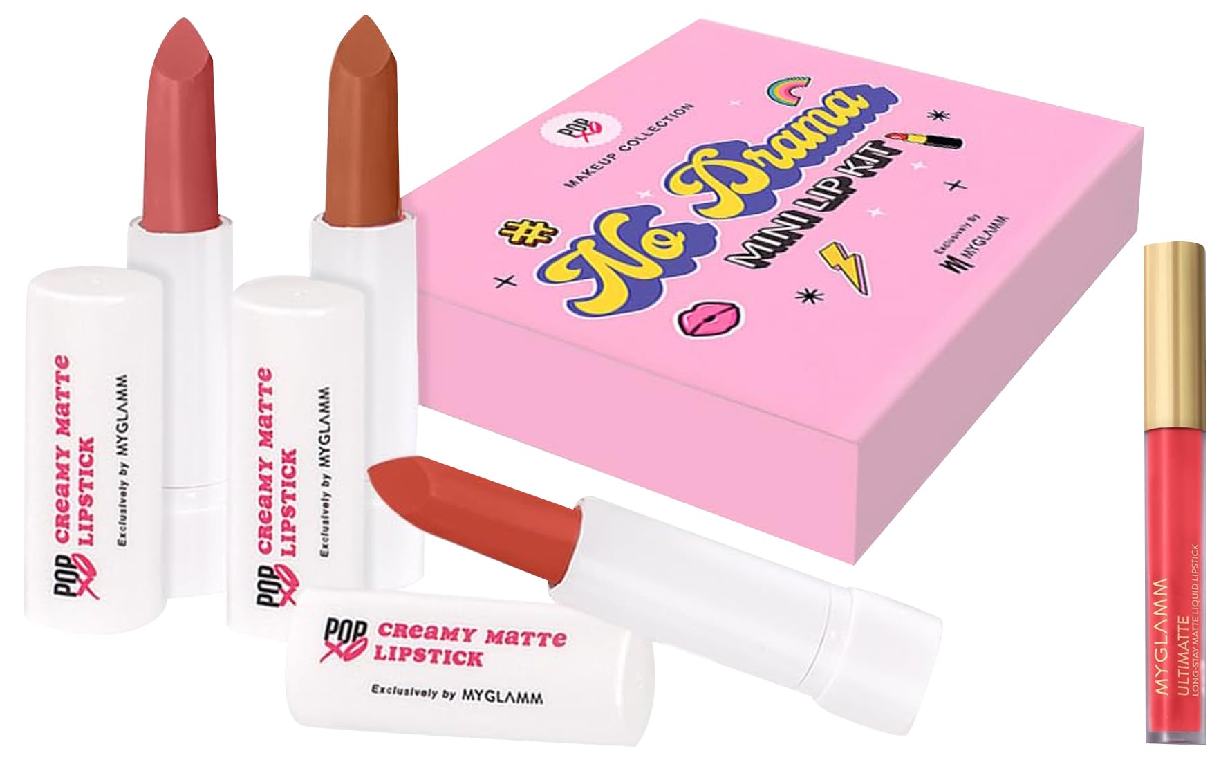 MyGlamm POPxo Makeup Collection No Drama Mini Lip Kit Lipstick Nude Lipstick Crme Finish Paraben Free Long Lasting Formula 3 in 1 Combo 7.5gm (Pack of 3)Save the drama for your mama! No Drama - Mini Lipstick Kit is a set of 3 gorgeous creamy-matte nude lipsticks that will add a little extra something to your #NoMakeup selfies. No-fuss no-frills just dreamy lippies that you can pair with just about anything. This mini lip kit includes 3 irresistible nude lipsticks - one for every mood duh. The lipsticks have a creamy matte formula that glides on the lips smoothly and wears comfortably for long hours. The pigmented formula delivers rich colour payoff in one swipe and is designed to be suitable for all Indian skin tones. "I have too many lipsticks" - said no one ever! That's because we know the real power of a good lipstick on a bad day.MyGlamm Ultimatte Long Stay Matte Liquid Lipstick-Coral Slayer-2.5 g | Coral Lipstick With Vitamin E | 8hr Long Lasting Lipstick | No-Smudge Waterproof Formula | Vegan & Cruelty FreeThe MyGlamm Ultimatte Long-Stay Matte Liquid Lipstick is a highly-pigmented miracle formula enriched with Vitamin E and glides on easily resulting in a matte finish that doesn't settle into lip lines. In just a single stroke itll give you a full burst of color that lasts for up to 8 hours while keeping your lips well-hydrated and nourished making it the perfect choice for everyday wear.
