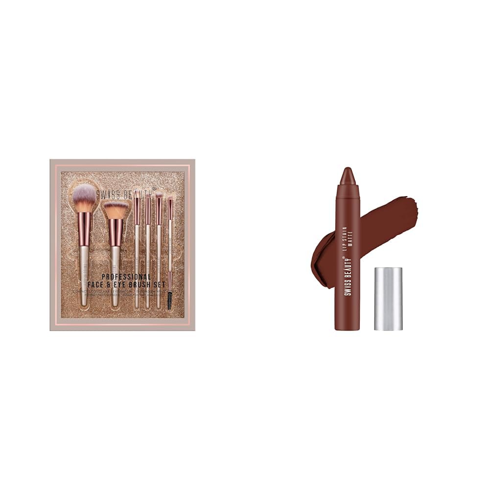 Swiss Beauty Professional Face & Eye Brush Set of 6 | Synthetic Fibres | Easy BlendingBrand Name : Swiss Beauty About Us : Swiss Beauty is the World's fastest growing beauty brand with a strong geographical footprint which inspires women to stay unique and classy. It's Vision is Beauty with Glamour Excitement and Innovation through high quality products at affordable prices. It offers one complete makeup kit with wide range of world class cosmetics and skin care products for your Face Nails Eyes and Lips with huge variants in Mascara Kajal Eyeliners Eyeshadows Foundations Concealers Blusher and Powders. Product Name : SB-F01_1 Product Description : Swiss Beauty combines high-tech materials with innovative design brush to make creating a pixel-perfect look easier than ever Synthetic bristles are ultra-plush and smoother than the hair you'll find in other brushes. It creates flawless base enhanced look and the perfect finish like a pro. Each brush head is perfect shape allowing for precise application from dense coverage to a soft delicate finish. The collection is suitable for a wide range of products and every makeup need from powders creams and liquids to mineral makeup highlighter and shimmer. Brush names on the handles make for easy reference when creating your favorite look.Swiss Beauty Stain Matte Lipstick | Long Lasting Hydrating & Lightweight Lipstick | Cafe Mocha 3.4gmA lipstick that delivers instense moisture while providing a matte finsh. Swiss Beauty lip stain matte's for unrivalled moisture and comfort along with a create an instense matte look. Swis beauty lip stain matte is combined with deep pigments to give a deep colour pay-off maintaining ultimate moisture and comfort.