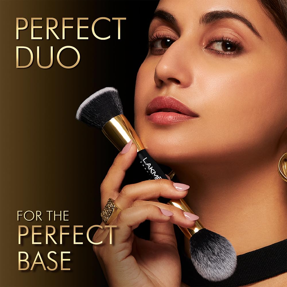 The Lakme Absolute Dual Ended Foundation & Powder Brush will be your go to for achieving a flawless base. Cover imperfections and get an even tone effortlessly without making it look cakey. This brush is designed to give you a smooth base creating the perfect canvas for the rest of your makeup. Made using high quality materials it helps achieve a professional looking finish on your skin. The wooden brush handle is smooth with a matte finish. Its expertly designed shape makes it easy for you to use. Blend and buff your skin with comfort from every angle. The super soft bristles have exceptional product pickup and feel luxurious and gentle on skin. Use the flat top with the square end to apply primer foundation as well as skincare products with ease! Short strokes will help achieve a smoother finish. Flip it and use the fluffy end to add finishing touches and set your makeup. Ideally pair the flat end with liquid and cream products and use the fluffy end with powder formats. Lakme Absolute Makeup Master Tools is a stunning new range of makeup application tools that includes 3 dual ended brushes and a dual sided blender. Explore the full range now and ace your makeup like a pro!