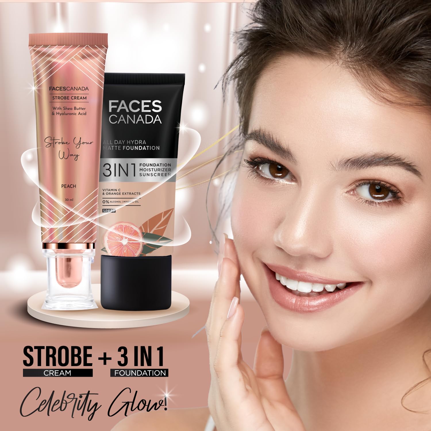 Flaunt your glow with the FACESCANADA Strobe Cream collection now available in 3 gorgeous new shades: Pink Peach and Gold in addition to our beloved Rose Gold and Silver. Our Strobe Cream is your ultimate ally for achieving a luminous dewy glow at home. The Pink shade is ideal for fair skin tones seeking a naturally flushed pinkish radiance. Peach suits medium skin tones offering a warm vibrant glow while Gold enhances dark skin tones with a rich golden shimmer. For those with faur skin who love an iridescent star like shine Silver is perfect for them. Last but not the least our cult favourite bestselling Rose Gold provides a radiant sun kissed glow suitable for medium to dark skin tones. Each shade of our Strobe Cream features Hyaluronic Acid the ultimate hydrating superhero that delivers deep hydration to ensure your skin remains radiant youthful and plump throughout the day. Shea Butter adds an extra layer of moisturization leaving your skin soft smooth and nourished. Our Strobe Cream is designed to enhance your natural glow with tiny brightening pigments that impart a subtle dewy finish. Pair with our Peaches N Cream Tinted Moisturizer For those who prefer a no makeup lit from within glow. Alternatively combine it with our 3 in 1 All Day Hydra Matte Foundation for a radiant celebrity like glow.