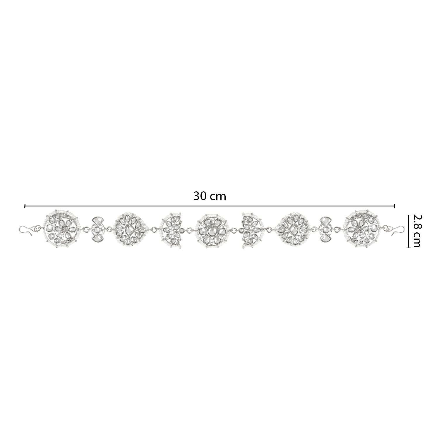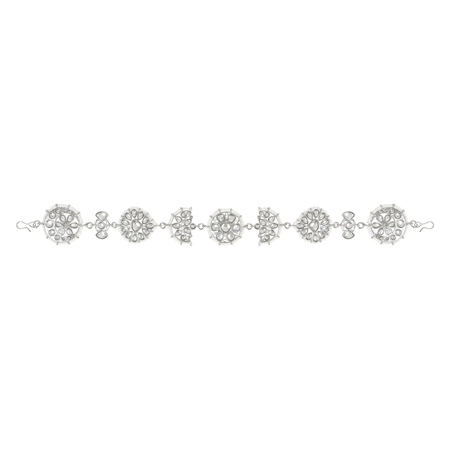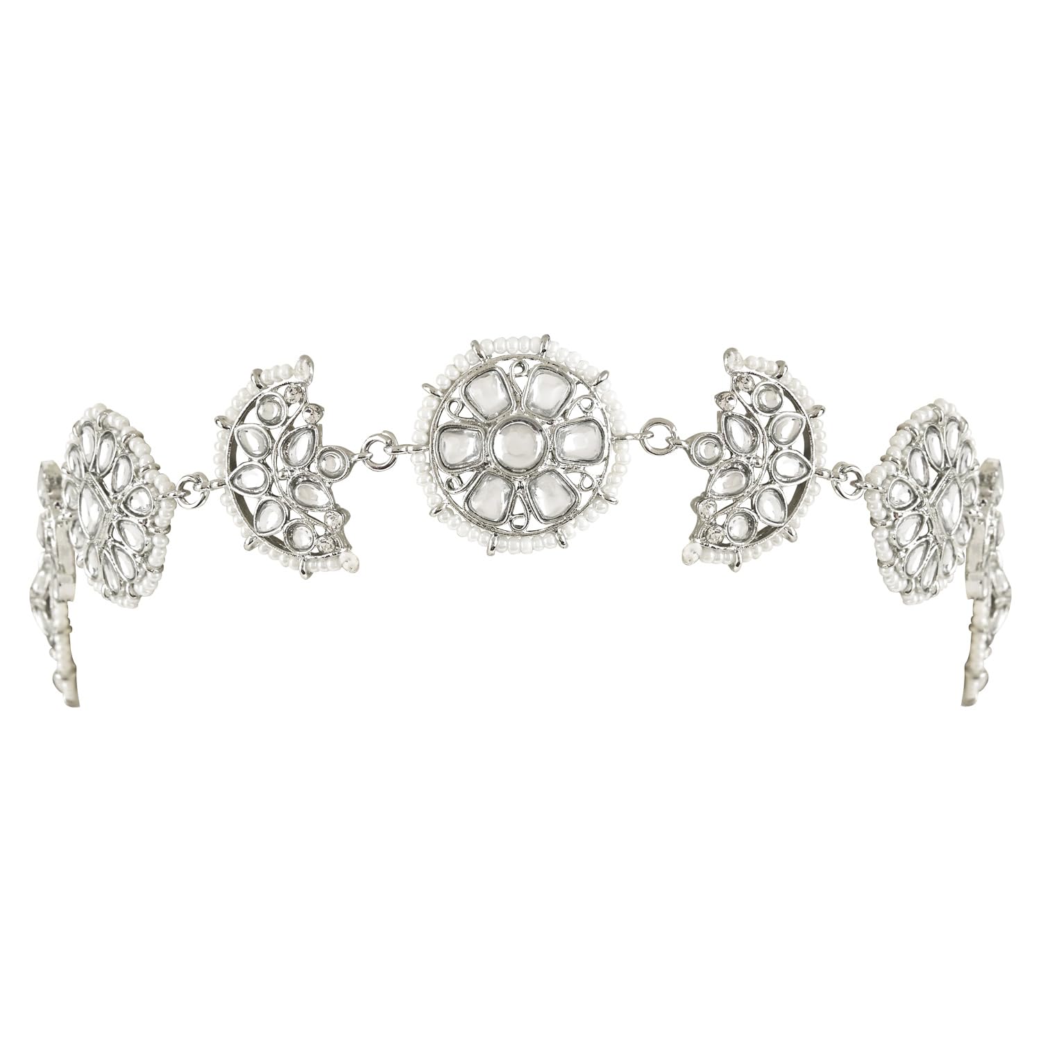 This is a stunning and traditional piece of jewelry that showcases intricate craftsmanship and luxurious materials. The piece features a floral design that is inspired by the traditional Rajasthani style which is known for its bold and intricate motifs. The base material of the jewelry is silver-plated which adds a lustrous and rich look to the piece. The silver plating also ensures that the piece is long-lasting and durable. The floral design is then embellished with kundan. The kundan stones used in this piece are of high quality and add a sparkling and elegant touch to the overall design. In addition to the kundan stones the piece is also studded with pearls which are known for their classic and timeless beauty. The pearls used in this piece are of high quality and have a lustrous and smooth surface that adds to the overall luxurious look of the jewelry. Overall this piece is a beautiful and traditional addition to any jewelry collection. Its intricate design high-quality materials and attention to detail make it a true work of art. Whether worn for a special occasion or as an everyday accessory this jewelry is sure to make a statement and leave a lasting impression.