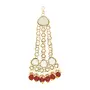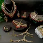 Celebrate your special day with the splendor of this radiant Gold-Plated Kundan Dulhan Bridal Jewellery Set. This opulent collection comprises a captivating long necklace an intricately designed choker and a pair of exquisite earrings. Completing the regal look the set includes a beautifully embellished nath (nose ring) a graceful passa (side headpiece) an alluring mathapatti (forehead ornament) and a pair of dainty panja (hand harness).The choker necklace adorned with glistening kundan and pearls exudes a captivating allure that perfectly complements any saree or lehenga enhancing your overall bridal appearance.Let this traditional bridal jewelry combo necklace set be the crowning jewel of your wedding ensemble reflecting your inner radiance and grace. Make your big day even more memorable with this stunning masterpiece that symbolizes eternal love and sophistication."