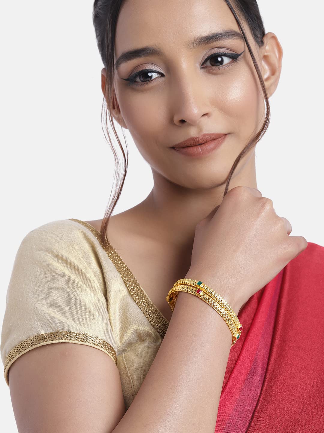 This bangle set is intricately crafted in 18K gold plating. It's embellished with pearls. This captivating bangle set is a great gifting option and is a perfect pick to add to your jewelry collection. You can style it with ethnic or western clothing. (Pack of 1) SIZES: Available in 2.4 2.6 2.8.