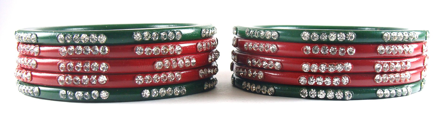 Upgrade your existing jewellery collection with this bridal red green chura from the house of LAC BANGLES. We present you beautiful six piece red & four piece green lac bangles studded with white color Stones which will add a magical sparkle to your dazzling persona and make your every moment memorable.