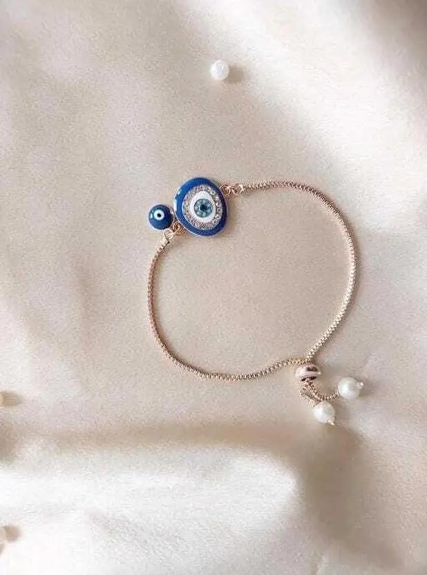 Add a touch of mystique and elegance to your jewellery collection with this stunning Evil Eye adjustable bracelet. The sophisticated design features a rose gold-toned chain adorned with two eye-catching Evil Eye charms in vibrant blue enamel - one larger medallion embellished with sparkling crystals and a smaller complementary charm. The delicate box chain is beautifully balanced with twin pearl drops at the adjustable closure allowing for a perfect fit. This versatile piece combines traditional symbolism with contemporary style making it suitable for both everyday wear and special occasions. The sliding closure mechanism ensures comfortable wear while the high-quality finish promises lasting beauty. The bracelet artfully blends classic elements like pearls with modern design sensibilities creating an accessory that's both meaningful and fashionable.