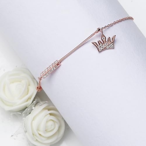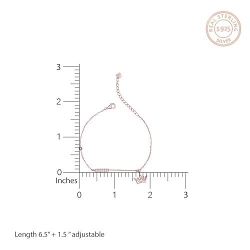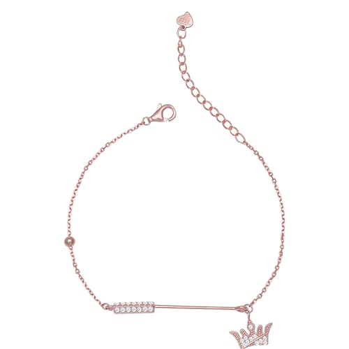 This Rose Gold Crown Bracelet features a dainty chain with a cute crown charm dangling from a dainty stick of sparkling CZ's. AAA+ Cubic Zircons Rose Gold Plated Sterling silver base Adjustable Anti-tarnish e-coated (with rhodium) to prevent silver from getting tarnished Comes with the GIVA jewellery kit and authentication certificate